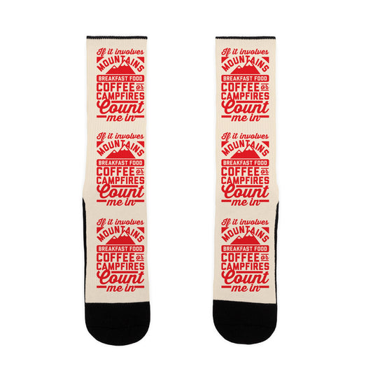 These socks feature the phrase "If it involves mountains, breakfast food, coffee, or campfires, count me in" and is perfect...