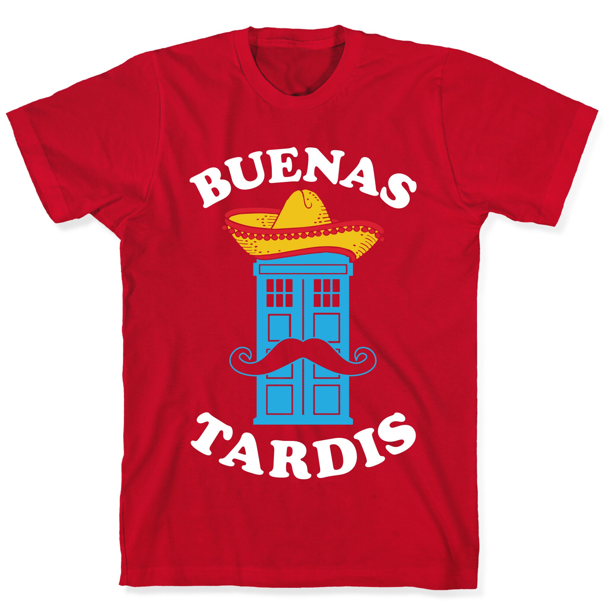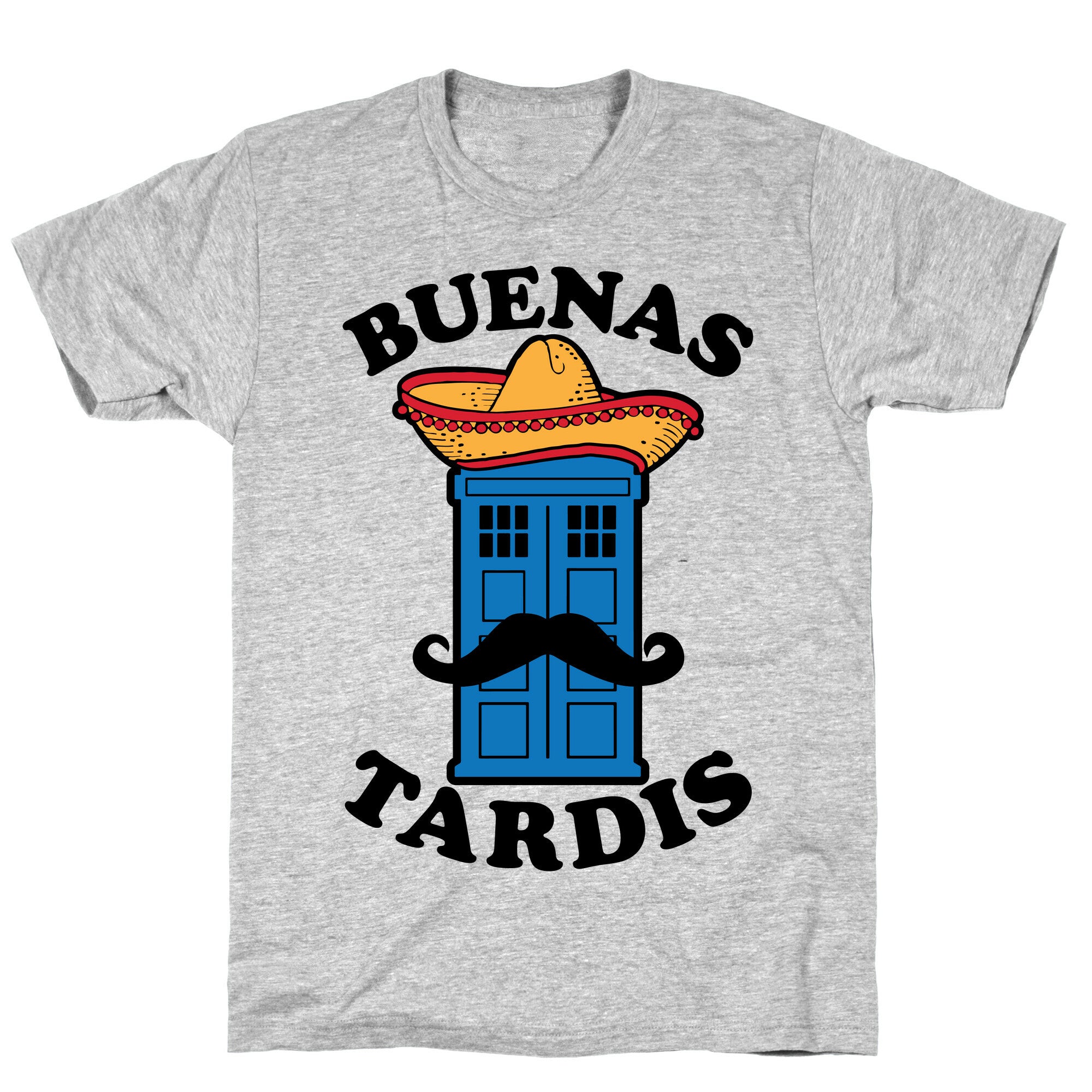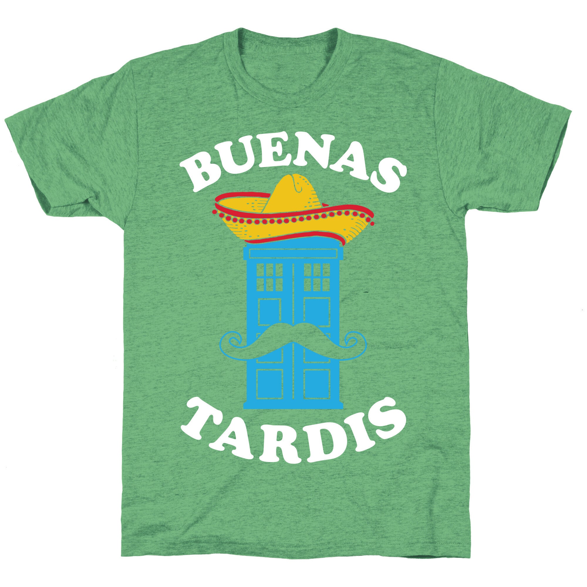 This cool, nerdy shirt features the Tardis wearing a sombrero and sporting a sweet mustache with the words "buenas Tardis!"...