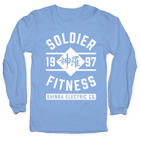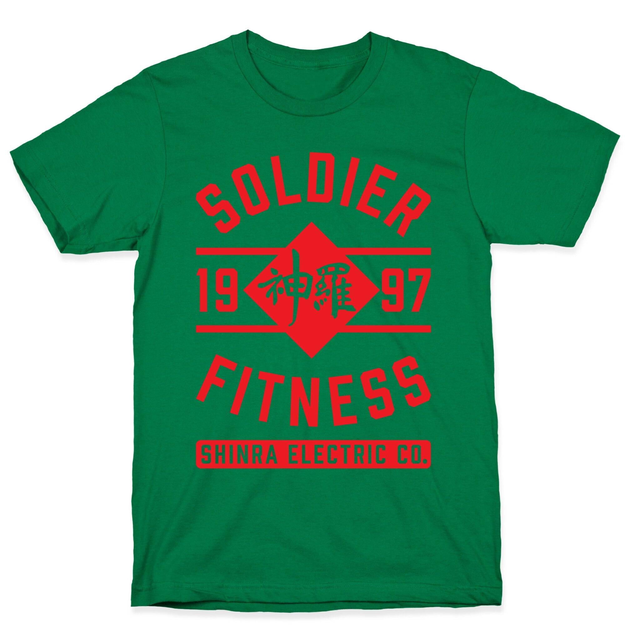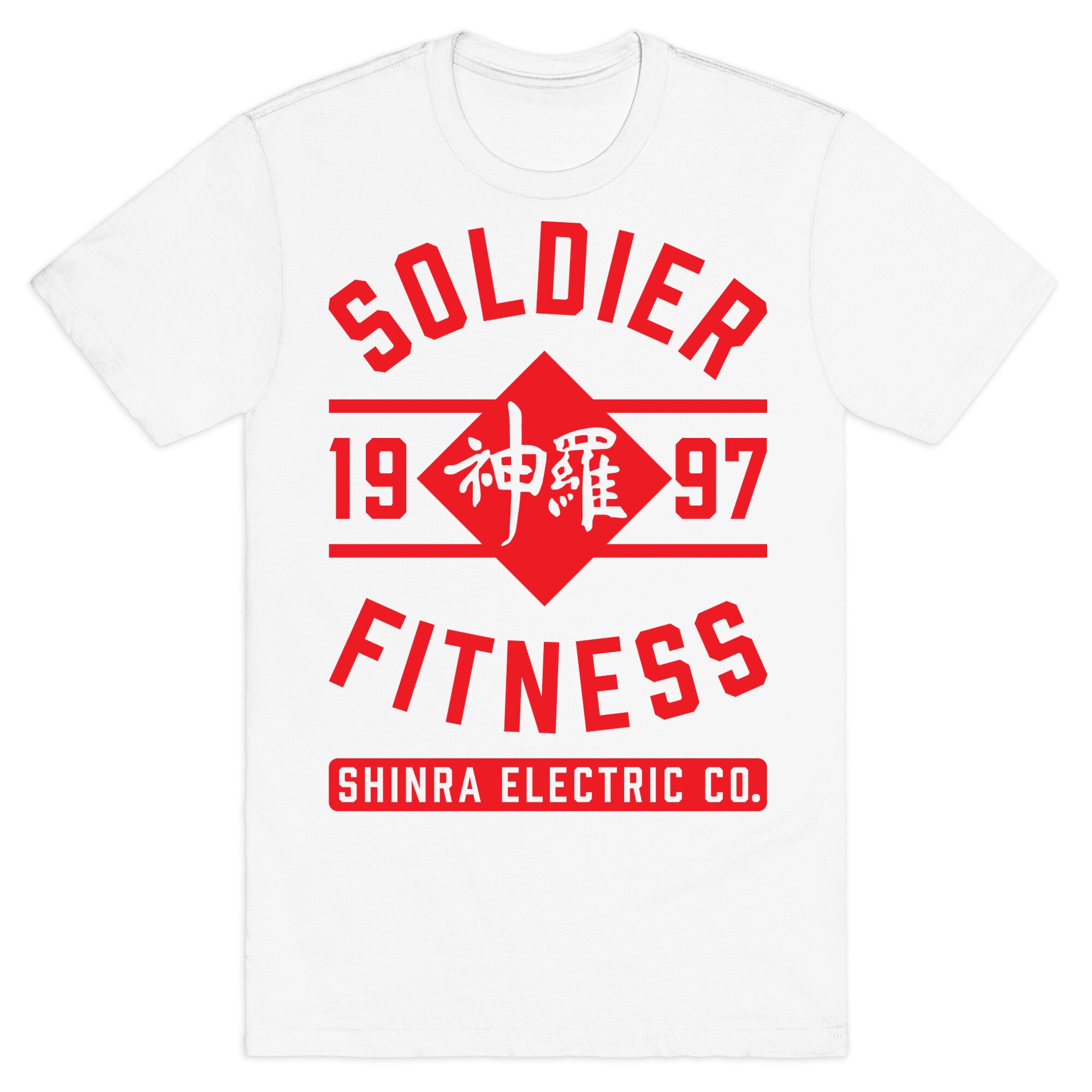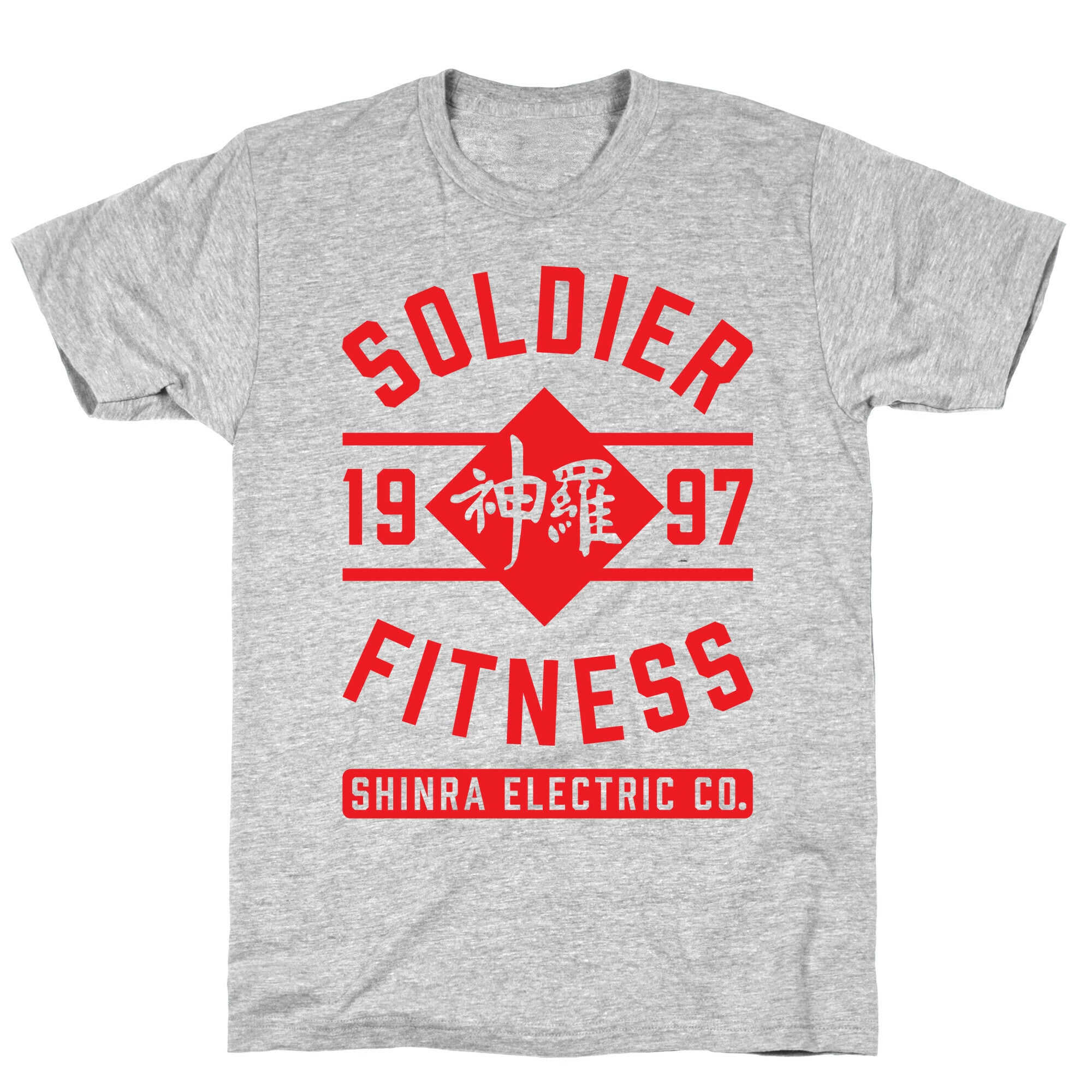 This shirt features the Shinra Electric Company logo and the words "Soldier Fitness" and is perfect for fans of Final...