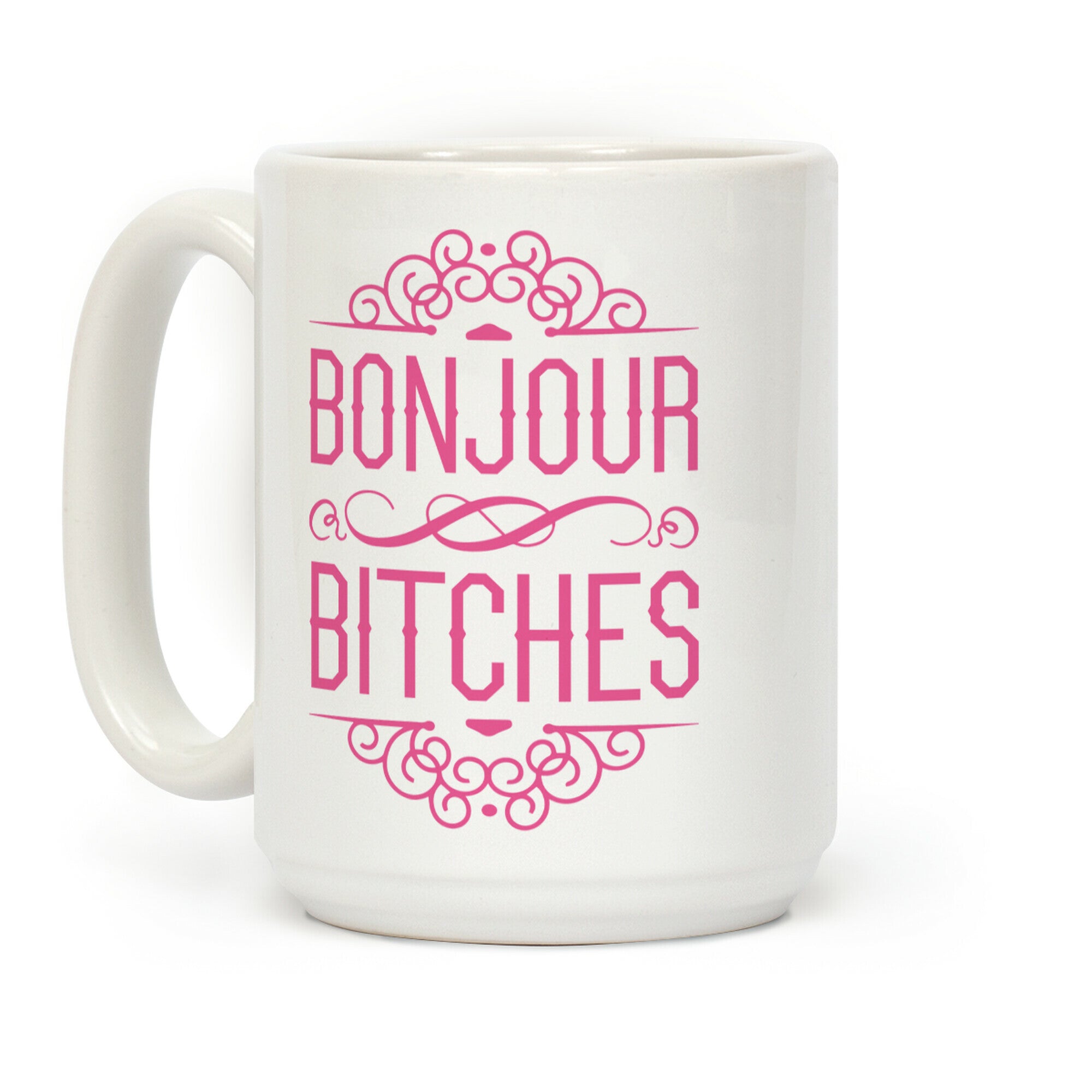 This funny French coffee mug features the words "bonjour bitches" and is perfect for sassy lovers of French, Francais, foreign...