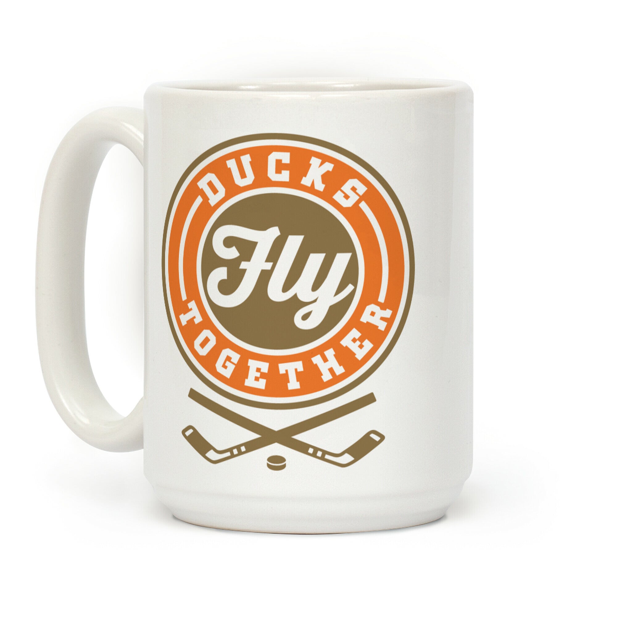 This cool hockey playoff mug features crossed hockey sticks and the words "ducks fly together" and is perfect for people...