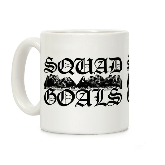 This funny Jesus coffee mug features the son of god surrounded by the twelve apostles and the words "squad goals"...