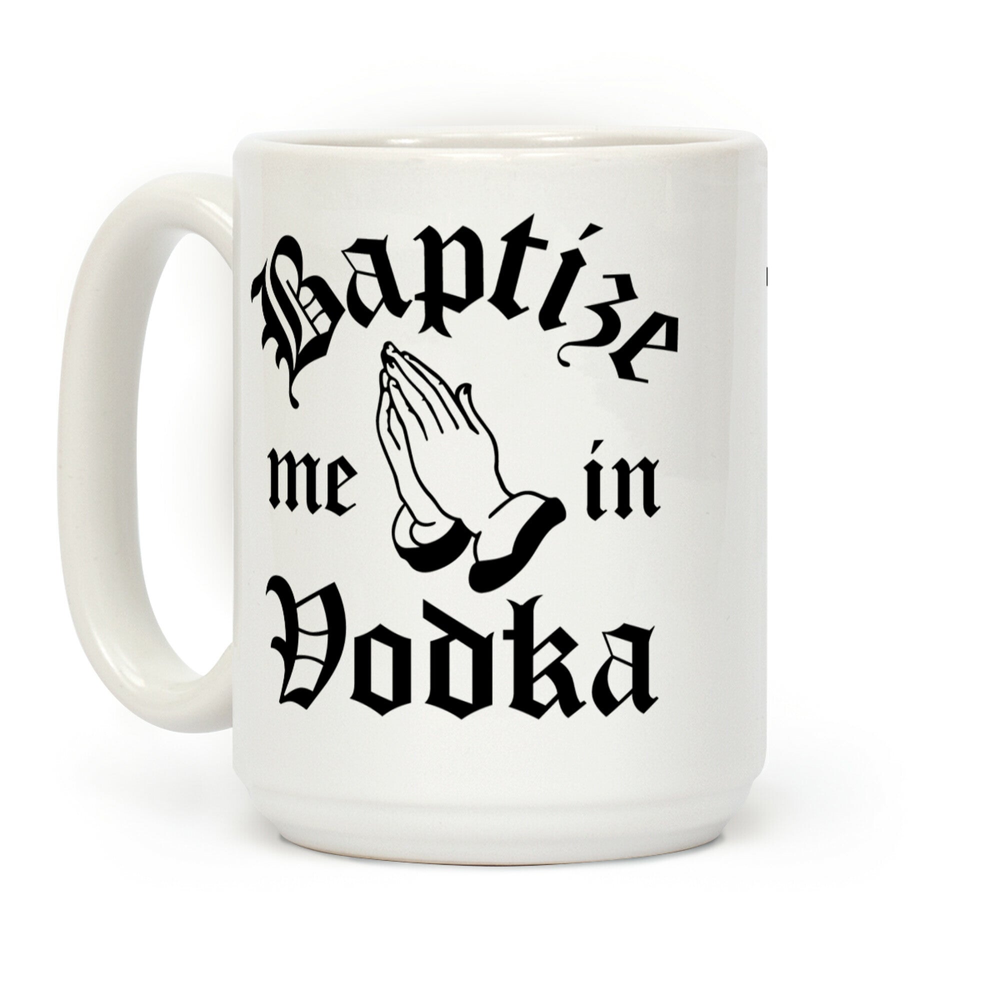 This funny drinking coffee mugs features praying hands and the words "baptize me in vodka" and is perfect for people...