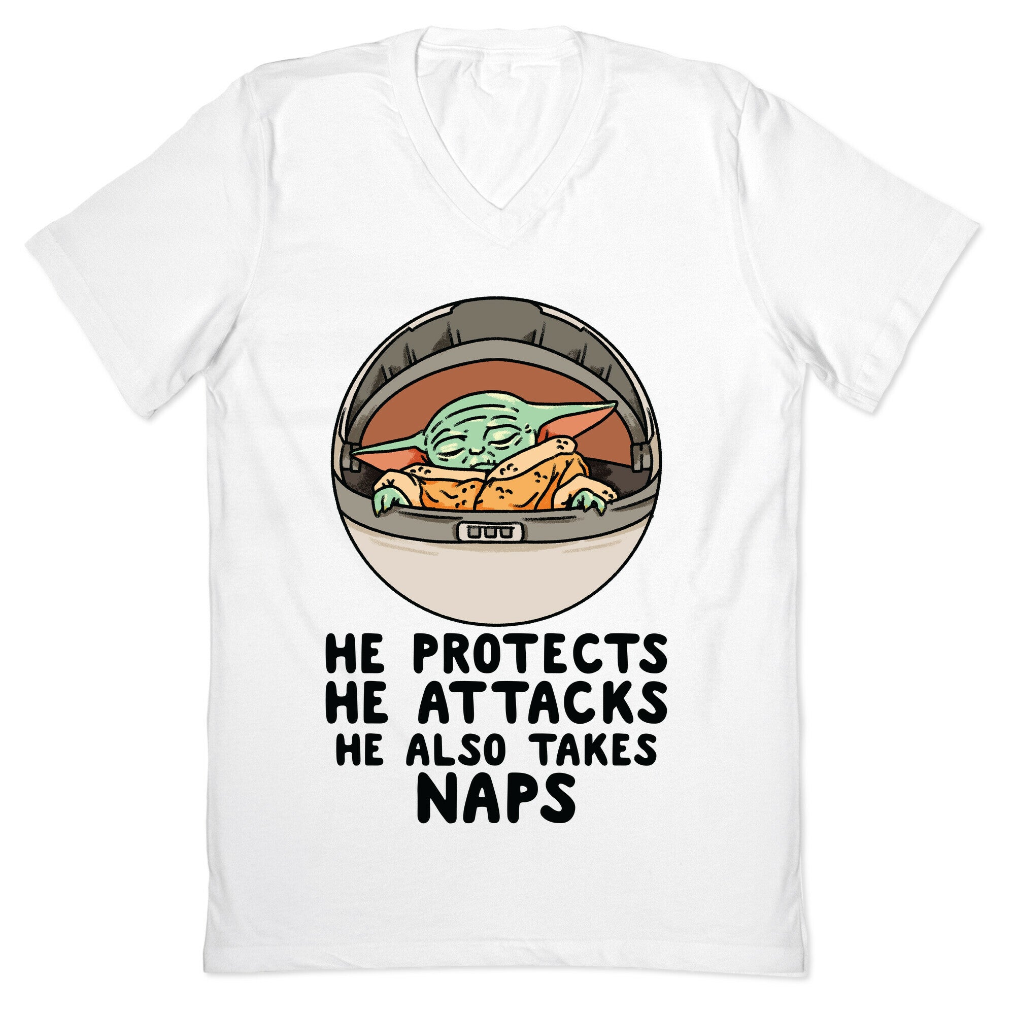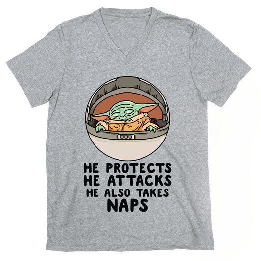 He Protects He Attacks He Also Takes Naps V-Neck