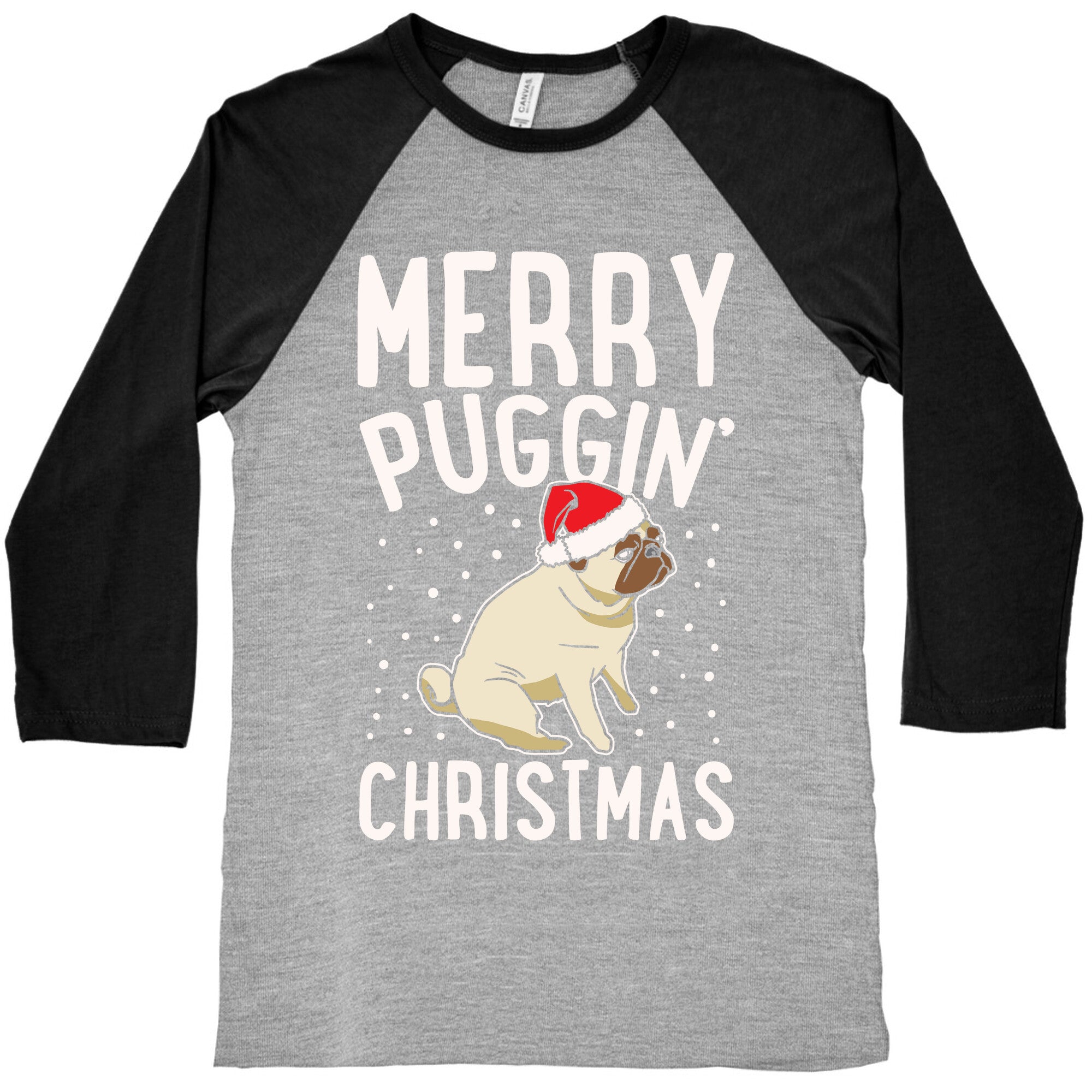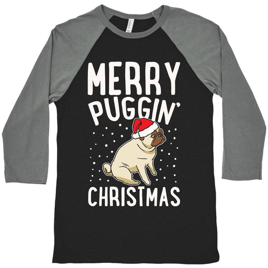 Merry Puggin' Christmas Pug White Print Baseball Tee