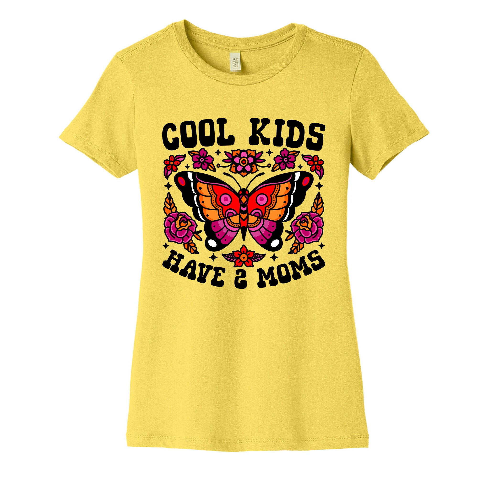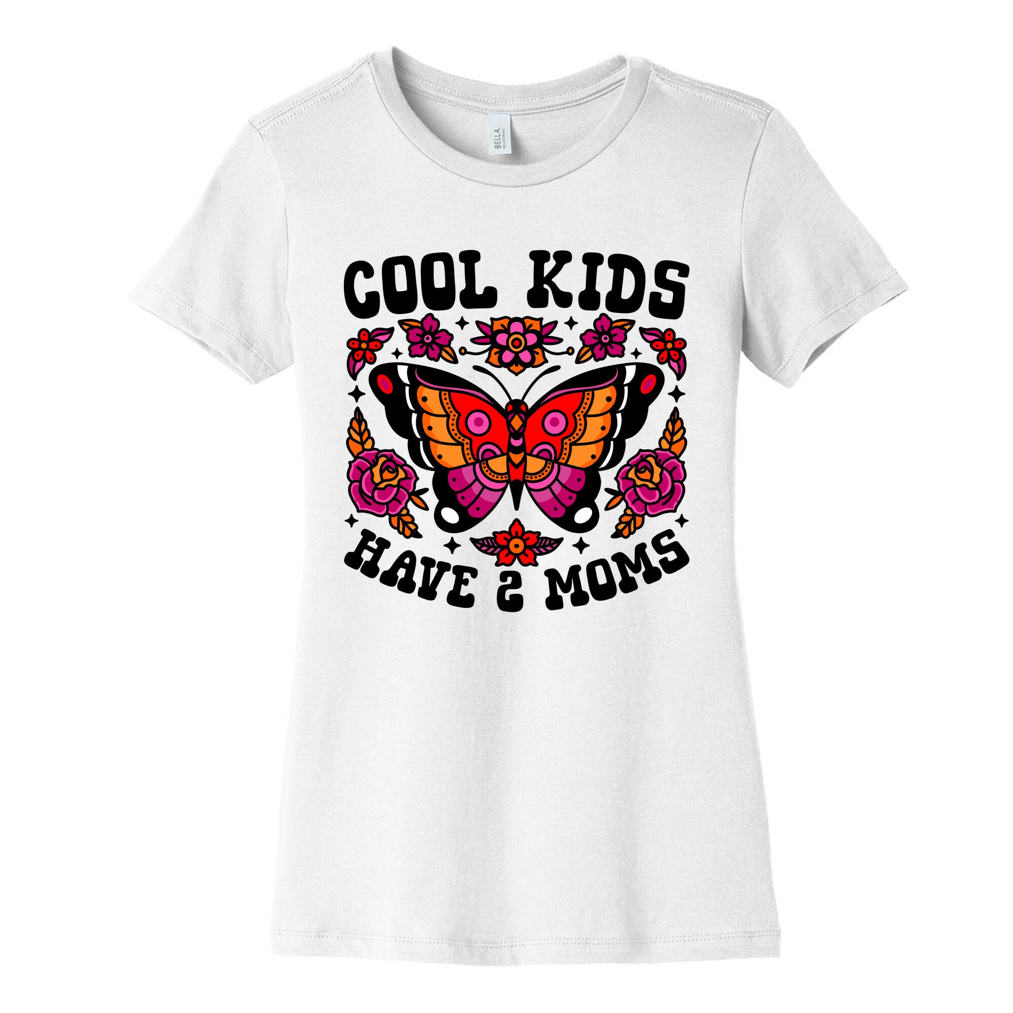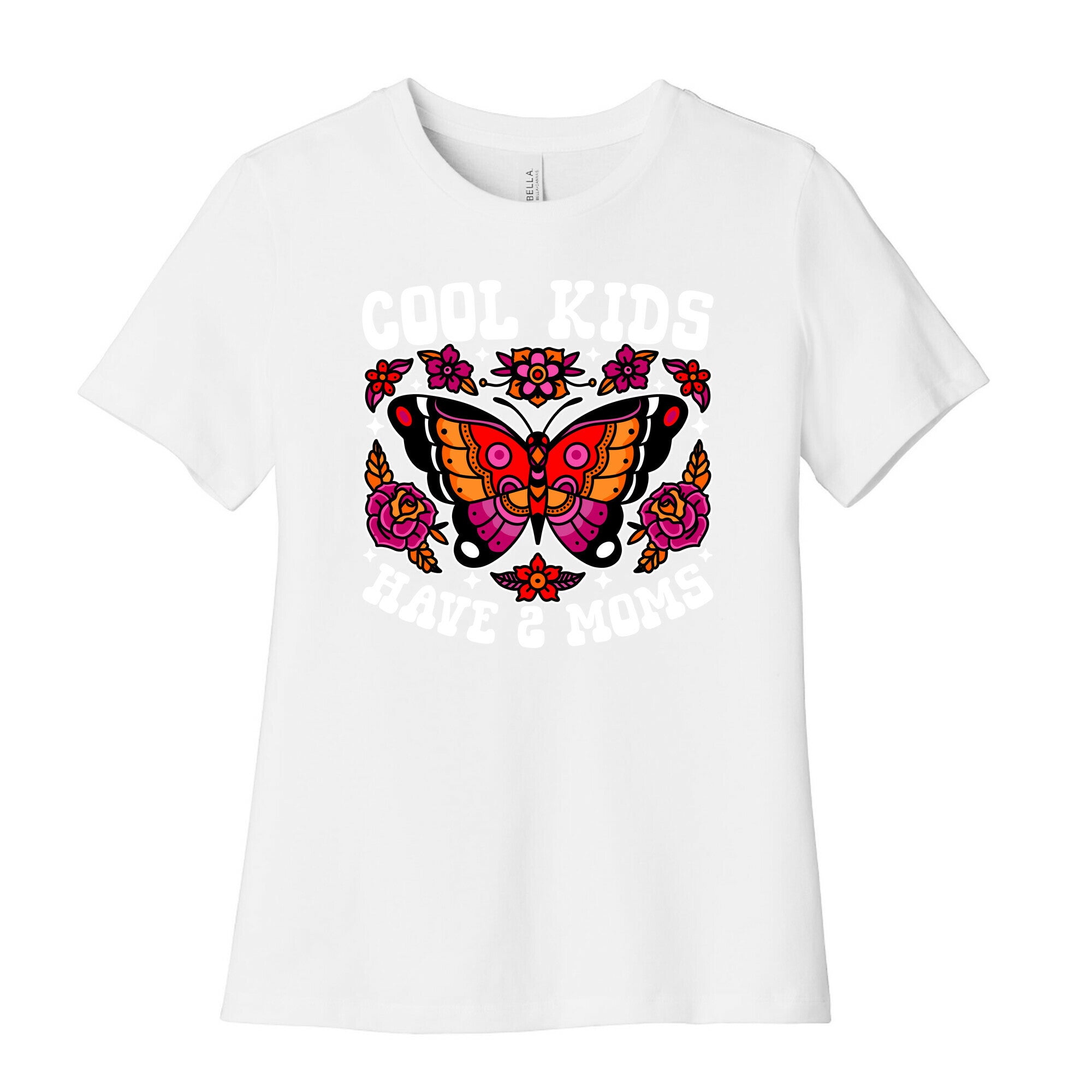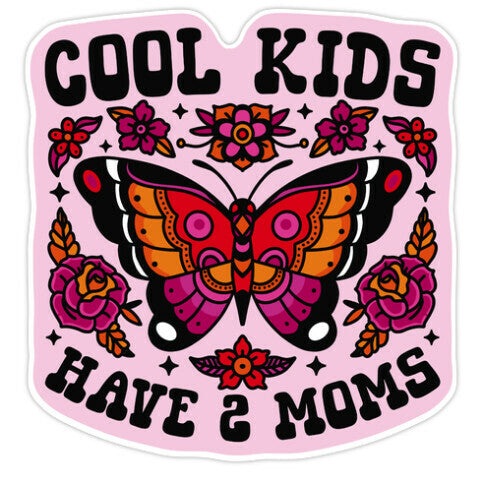 Celebrate love and pride with our vibrant Cool Kids Have 2 Moms design, featuring American traditional tattoo-style florals and butterflies...