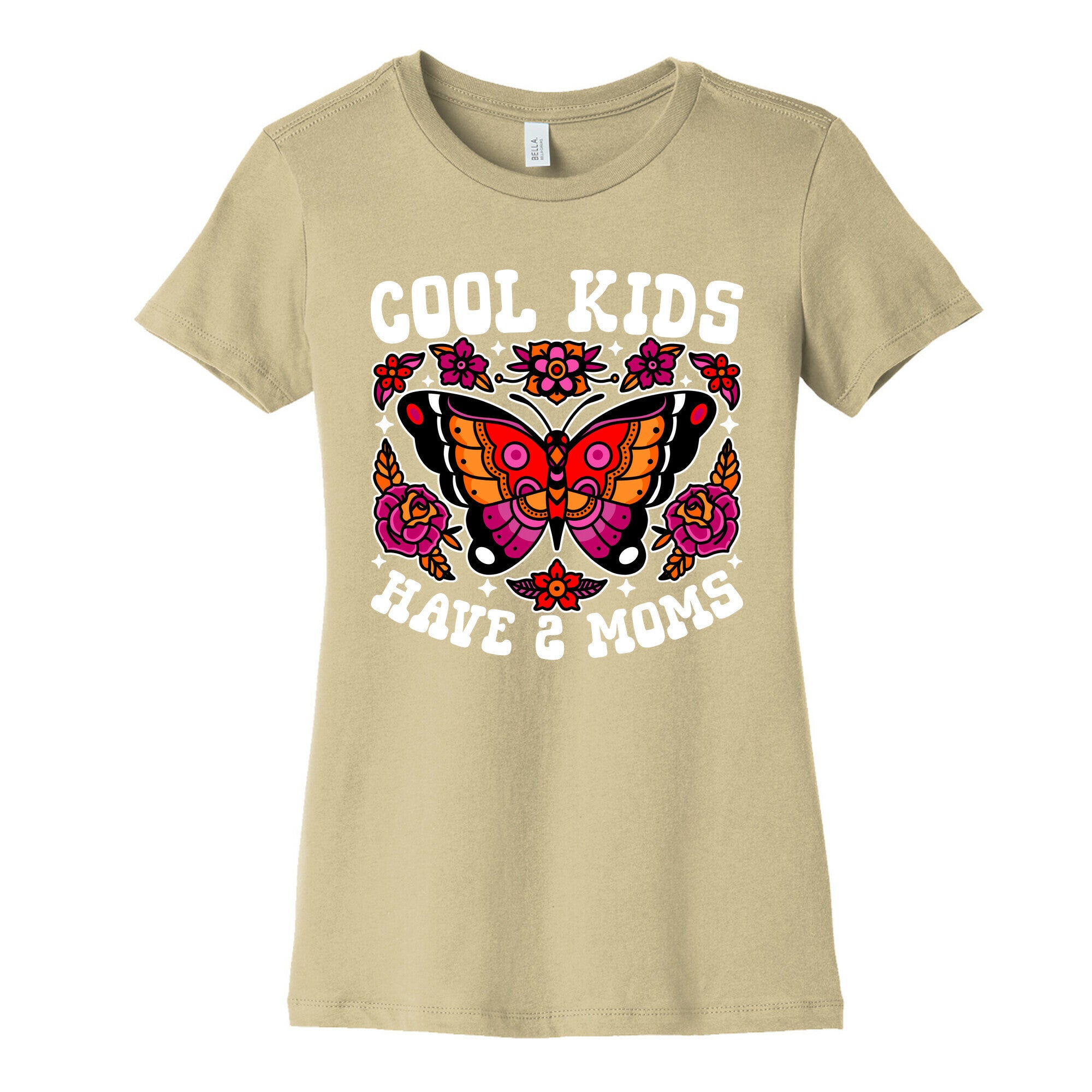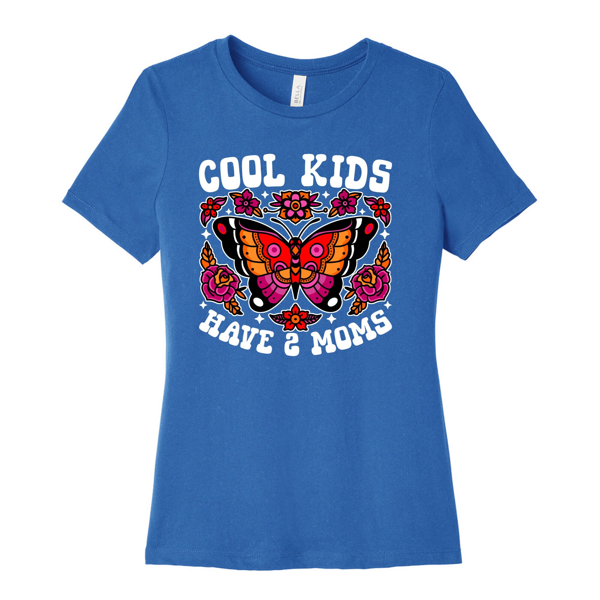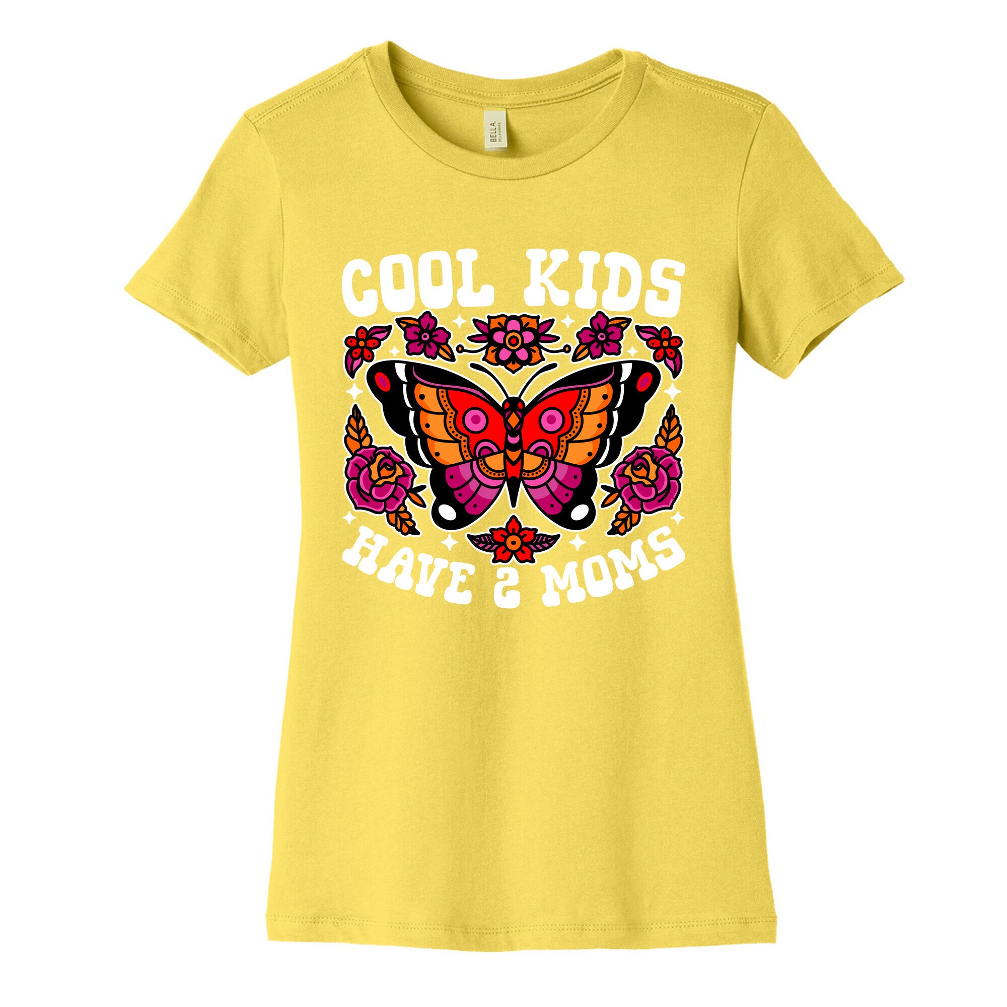 Celebrate love and pride with our vibrant Cool Kids Have 2 Moms design, featuring American traditional tattoo-style florals and butterflies...