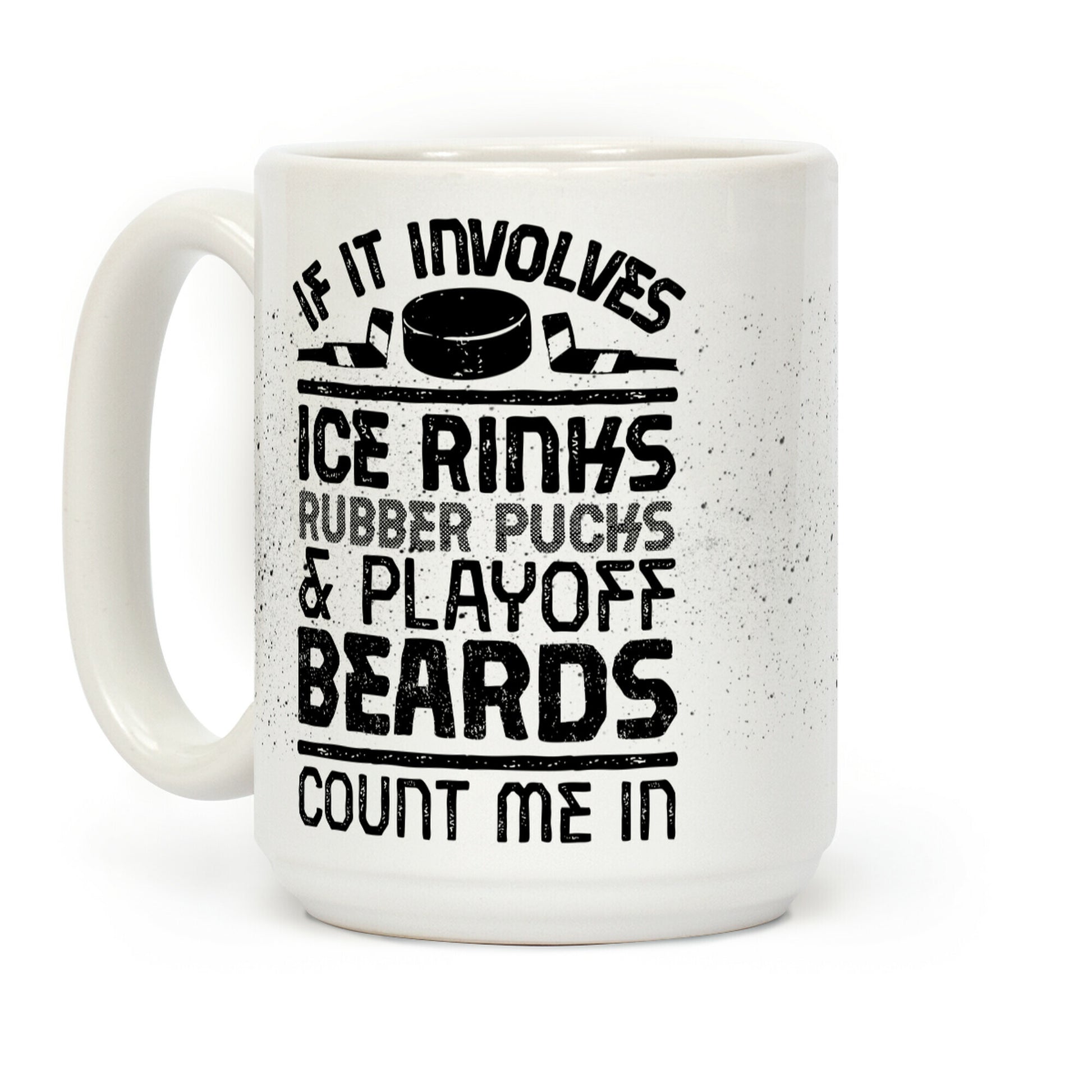 Show your love of hockey beards, slap shots, ice rinks and hockey pucks with this hockey fan mug that says "If it involves ice rinks, rubber pucks, and playoff beards, count me in!"! This coffee mug is perfect for swooning over hockey hunks, being a hockey hunk, growing your hair out during hockey season, watching the game, slapping some pucks, and getting into the rink!