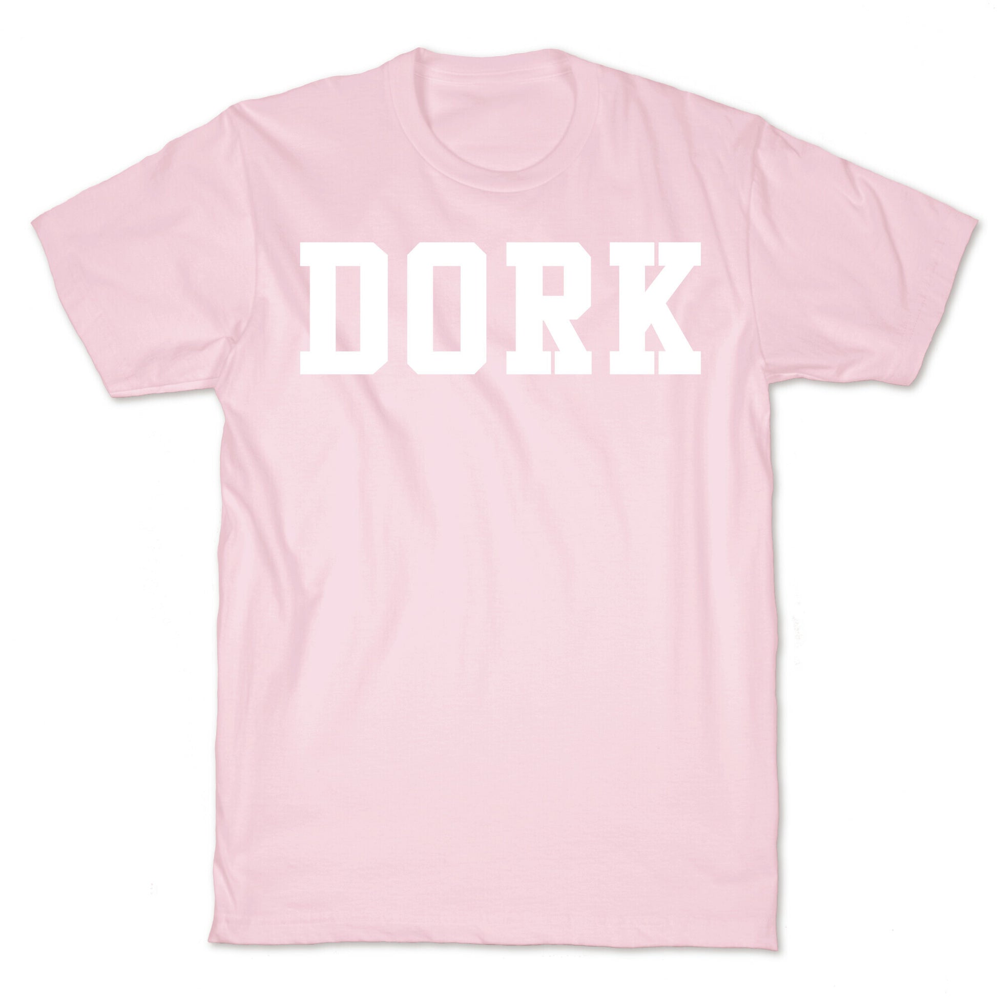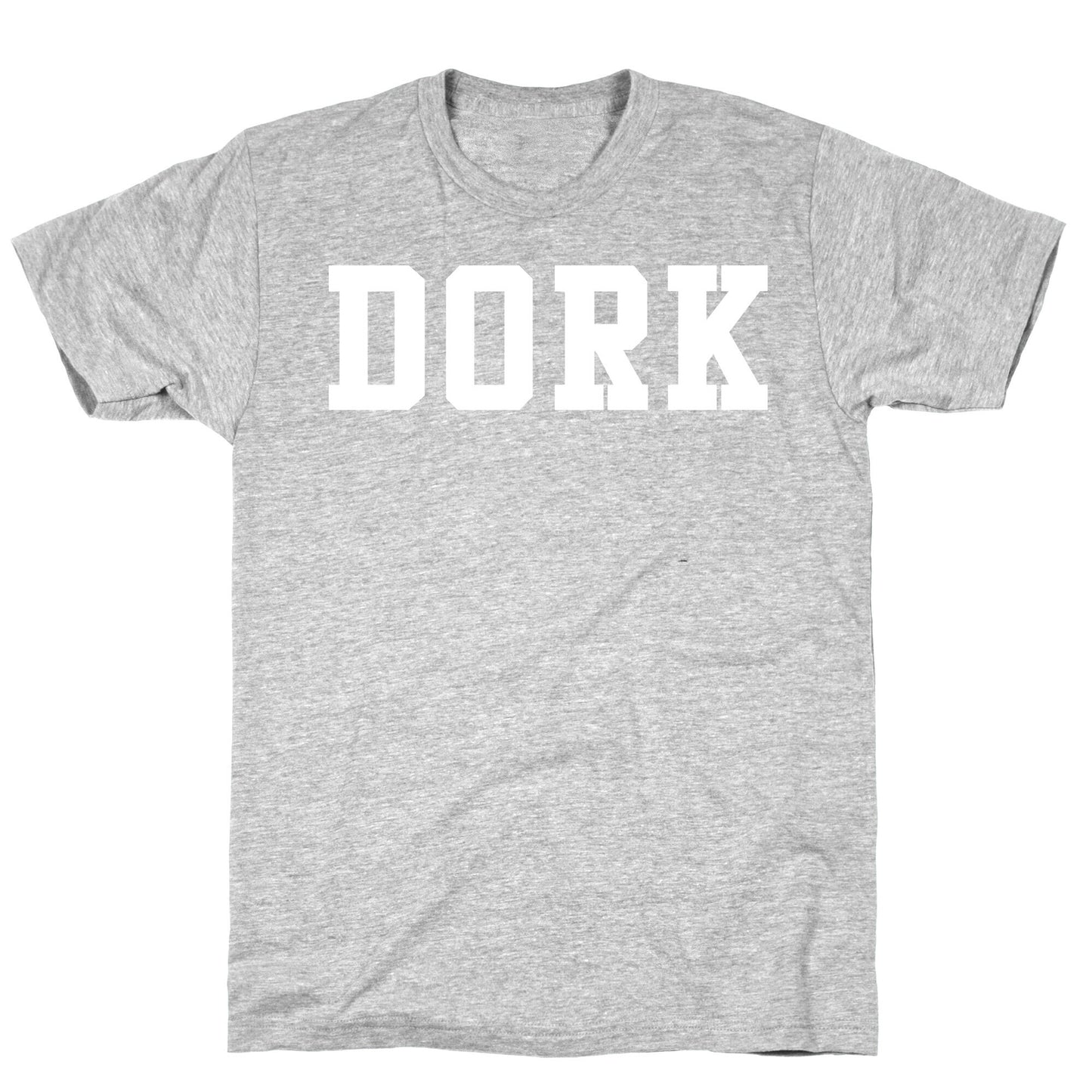 Say it loud, say it proud. Shirt reads "DORK" in athletic type. Our fitted Unisex Cotton tee is made from an exceedingly soft 100% ring spun cotton. It features a crew neckline with hemmed sleeves and bottom for durability. Preshrunk for your convenience! Printed in the USA. Made with 100% Ring Spun Cotton. Athletic Gray is made up of 90% cotton and 10% polyester. Other heathered colors are made of 52% cotton and 48% polyester.