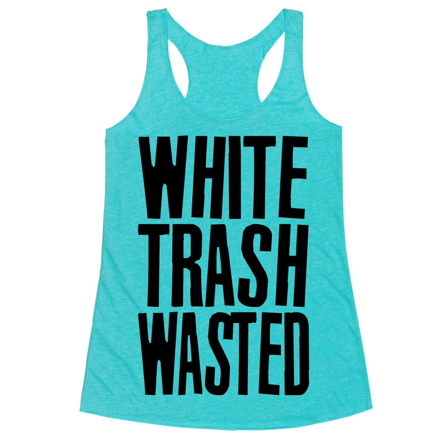 A shirt for the severely inebriated. Get white trash wasted!Our super comfortable Women’s Raw Edge Racerback features a soft tri-blend, unhemmed fabric, with a fashionable bell-like shape for the bottom. Preshrunk for your convenience! Printed in the USA. Made with 50% Polyester 25% Ring Spun Cotton, and 25% Rayon.