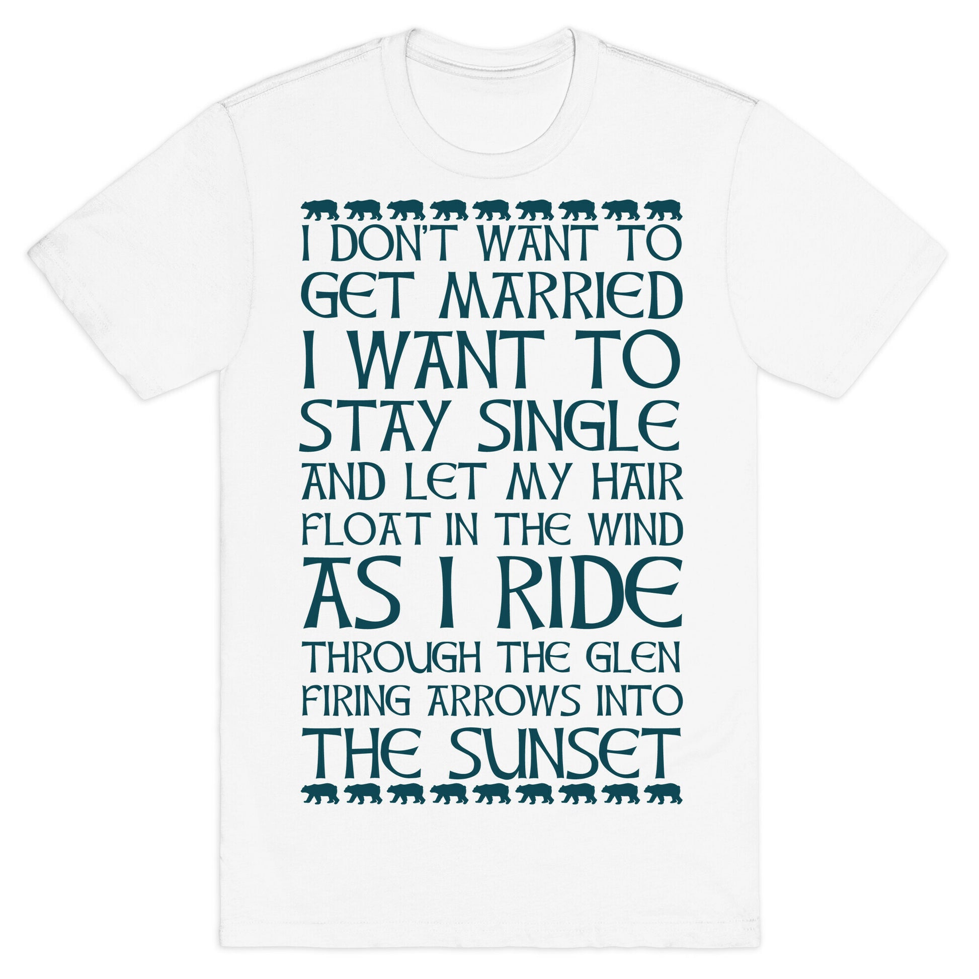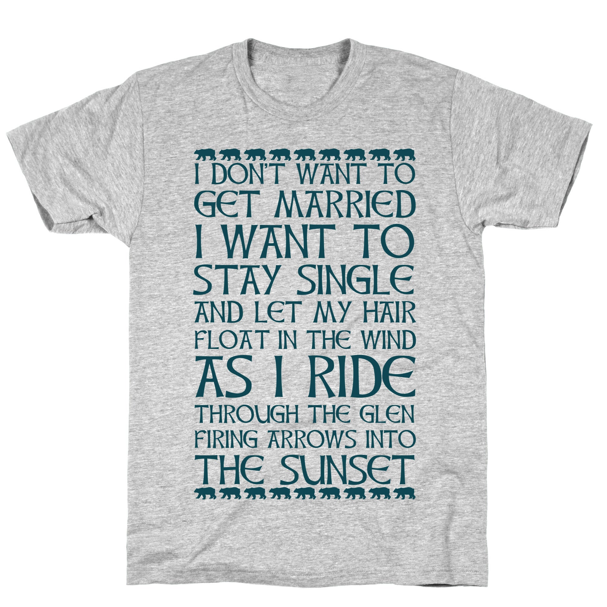 Channel your inner Merida with this quote from the movie Brave: I don't want to get married. I want to stay single and let my hair flow in the wind as I ride through the glen firing arrows into the sunset. Our fitted Unisex Cotton tee is made from an exceedingly soft 100% ring spun cotton. It features a crew neckline with hemmed sleeves and bottom for durability. Preshrunk for your convenience! Printed in the USA. Made with 100% Ring Spun Cotton. Athletic Gray is made up of 90% cotton and 10% polyester. Other heathered colors are made of 52% cotton and 48% polyester.
