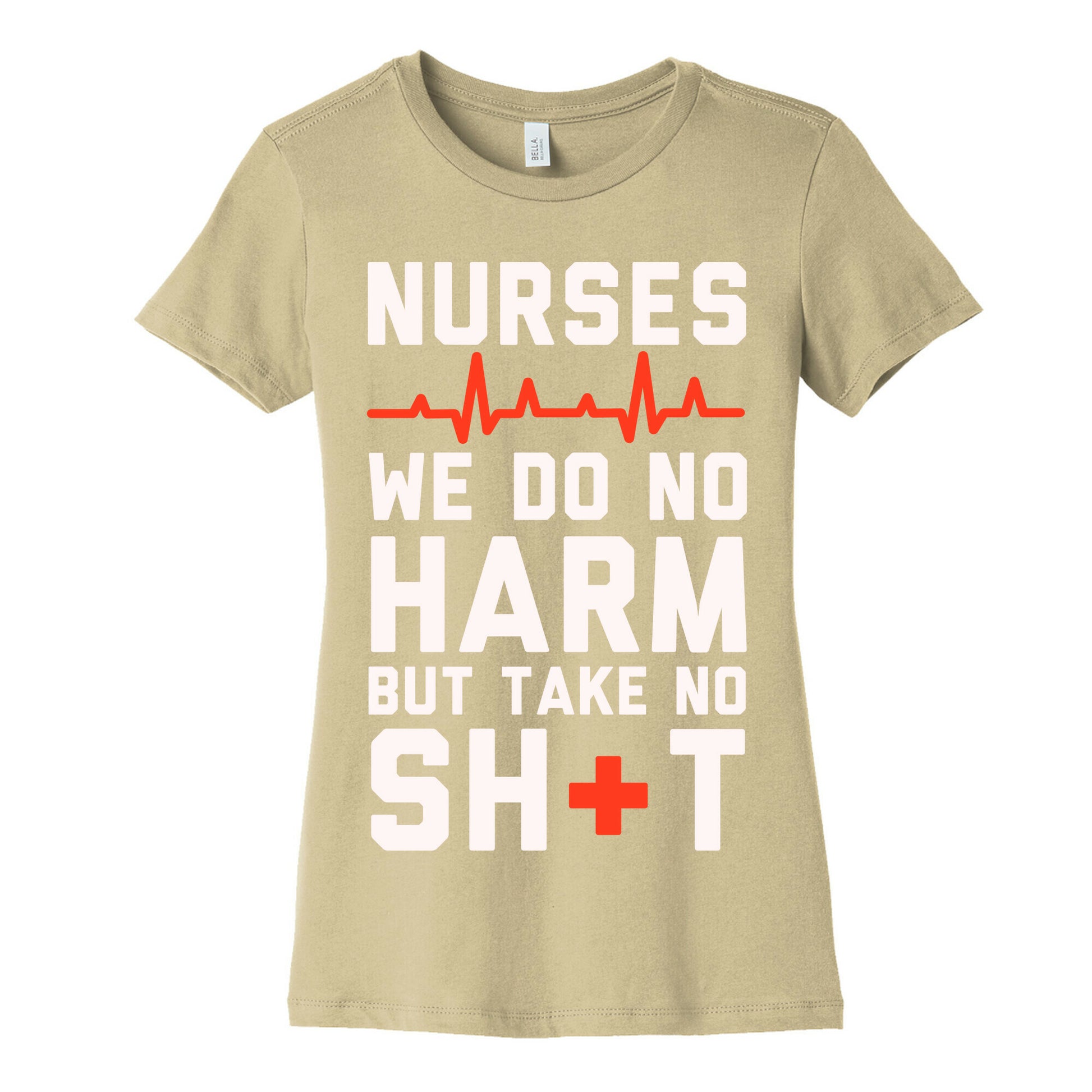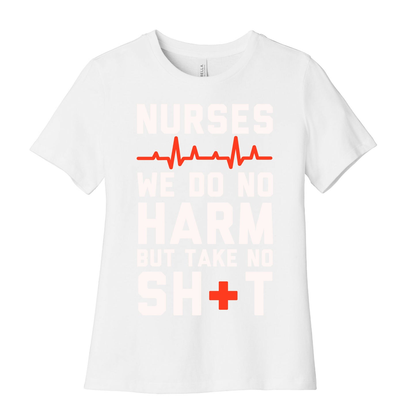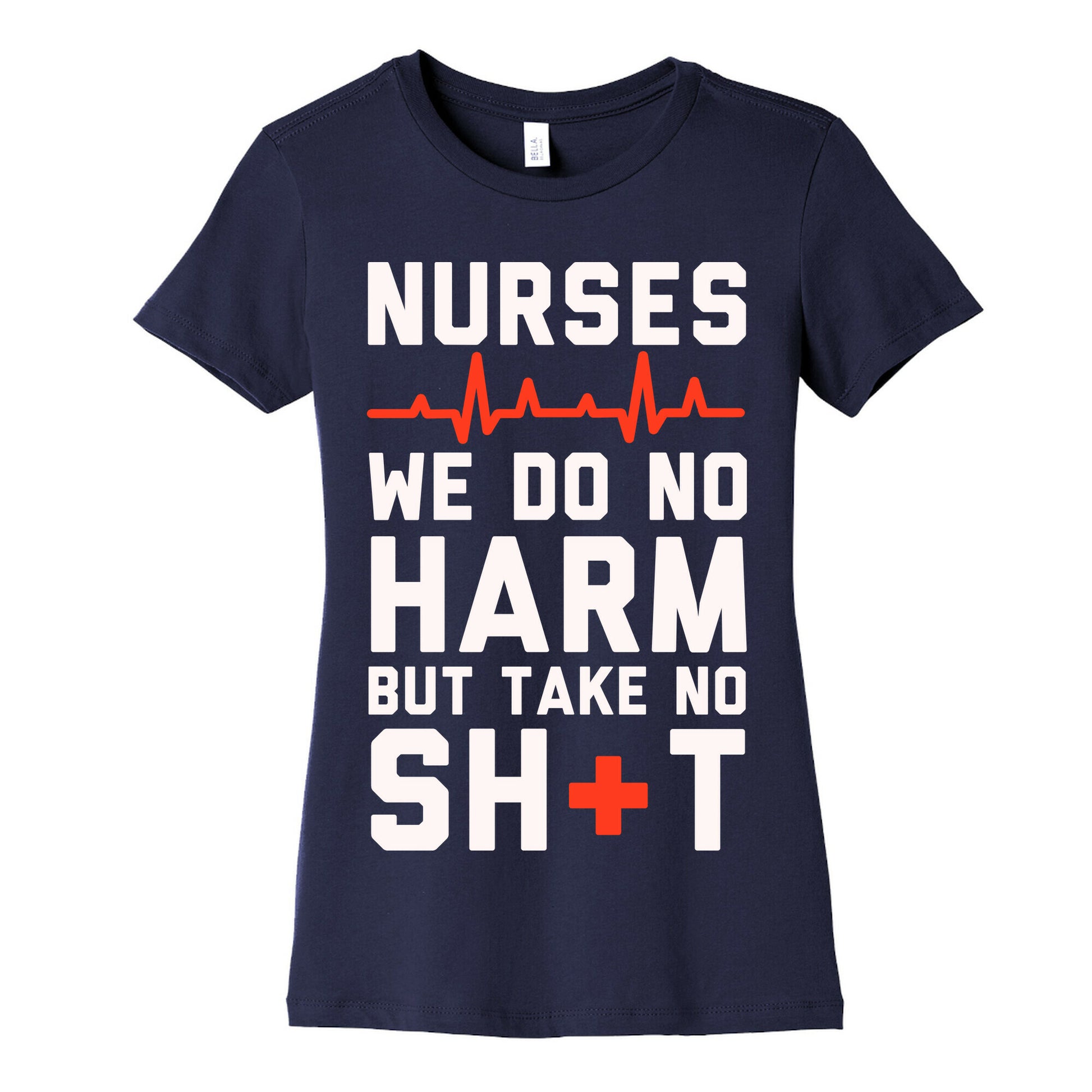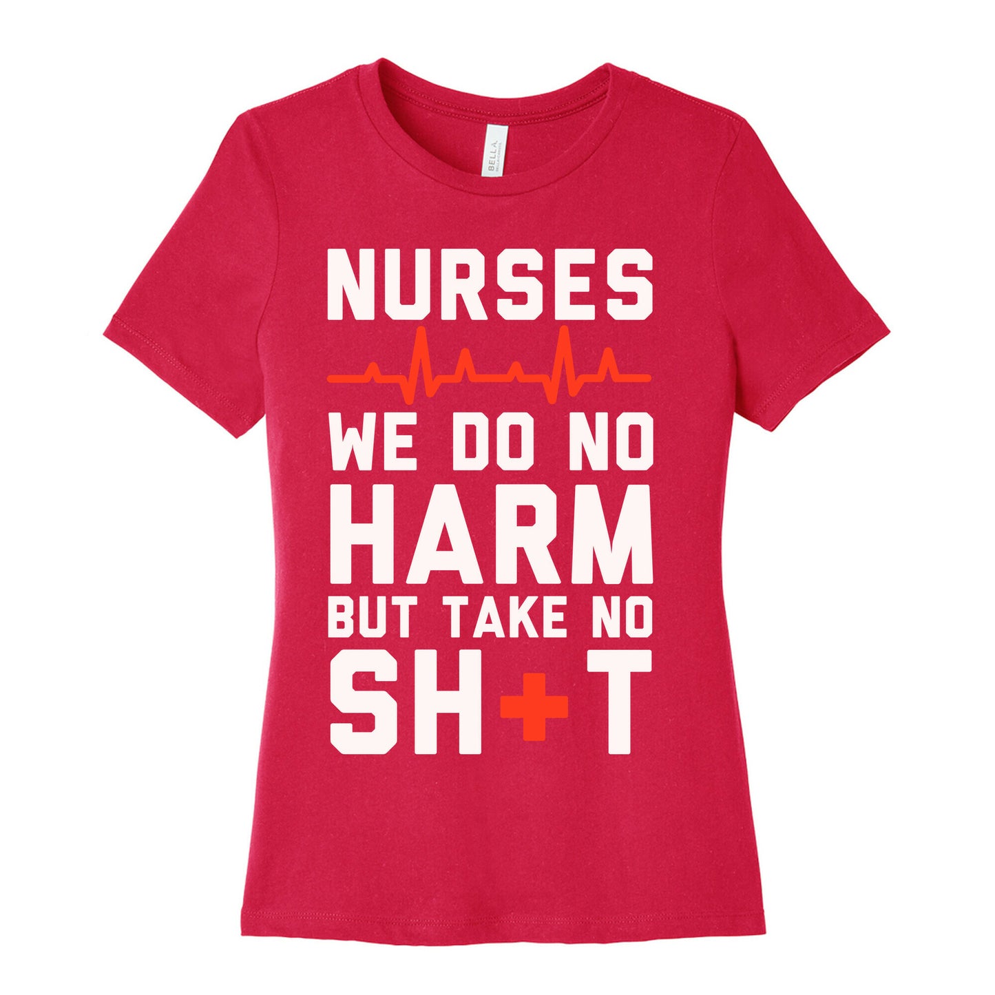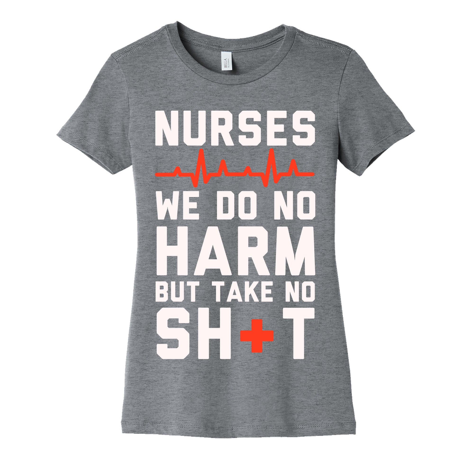 The code of nurses says to do no harm but it doesn't say anything about letting our patients walk all over us. So heal those you can but do not take any of their crap. If you are a nurse who needs something to wear under the scrubs, or something sassy to wear on those rare days off, this great nursing shirt which features a red cross and heart monitor!Our slim fit Women’s Cotton Tees, are made with exceedingly soft 100% cotton. They feature a relaxed neckline, and the sleeves and bottom, are hemmed for durability. Preshrunk for your convenience! Printed in the USA. Made with 100% Cotton. Colors such as gray, is made up of 90% cotton and 10% polyester, and deep pink is made up of 50% cotton and 50% polyester.