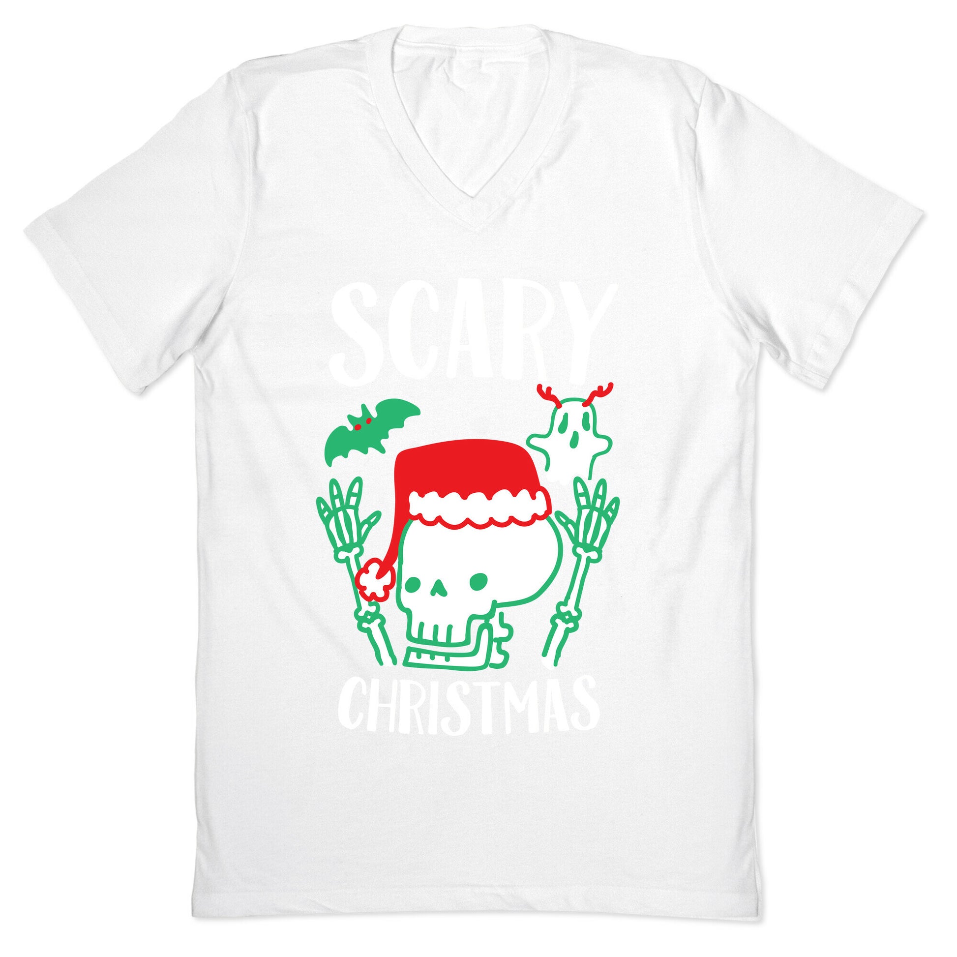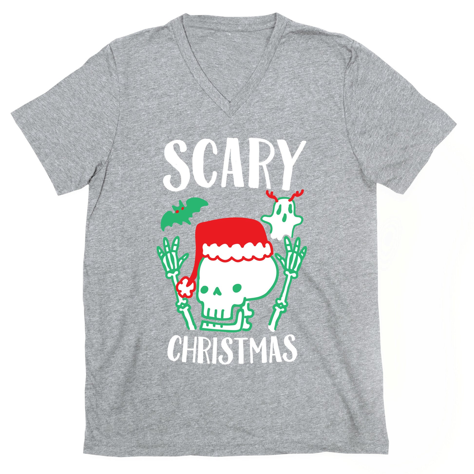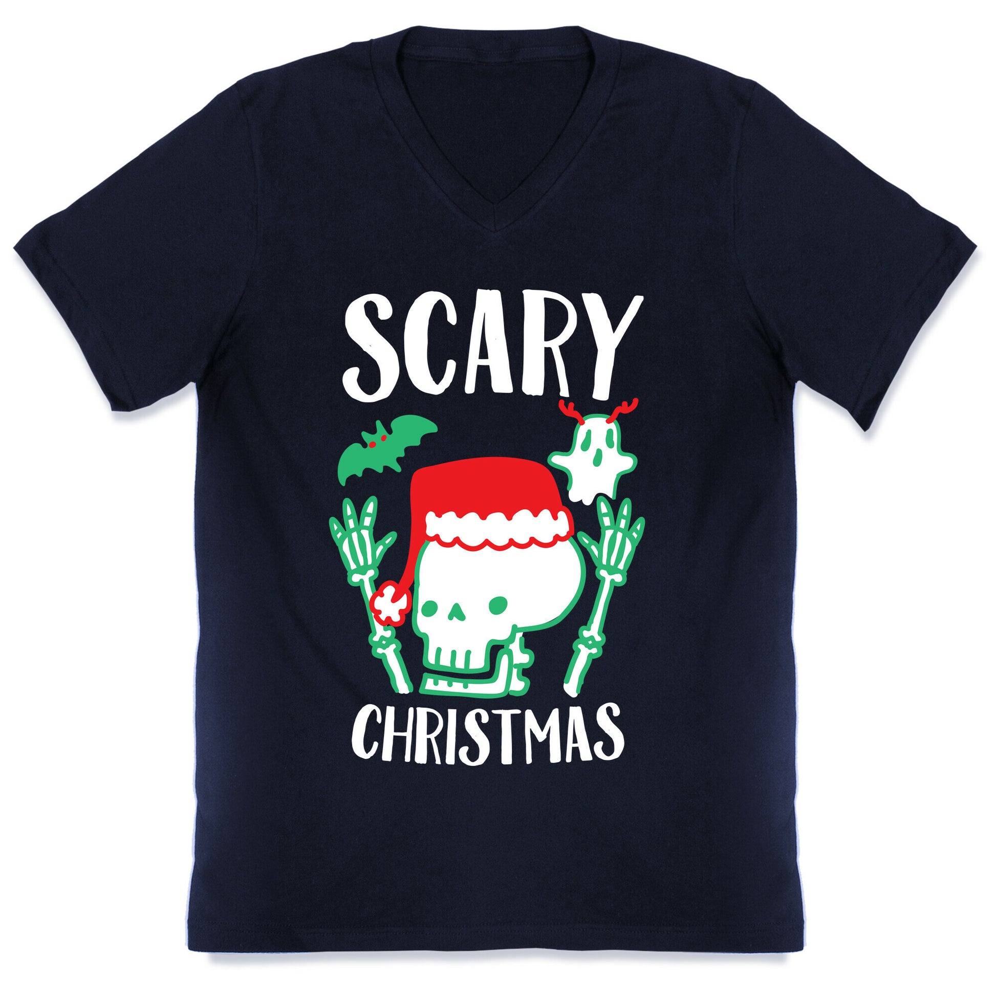 Just because it isn't Halloween doesn't mean you can't be a spooky scary skeleton anymore! Spread some holiday fright with this cute spooky pun on "merry christmas" featuring a bat that looks like holly, a ghost with reindeer antlers, and a santa capped skeleton! Our fitted Men's V-Neck tees are made with a soft jersey fabric. They feature a v-neckline, with sleeve and bottom hems for durability. Preshrunk for your convenience! Printed in the USA. Solid colors made with 100% Cotton and otherwise 90% Cotton and 10% Polyester.