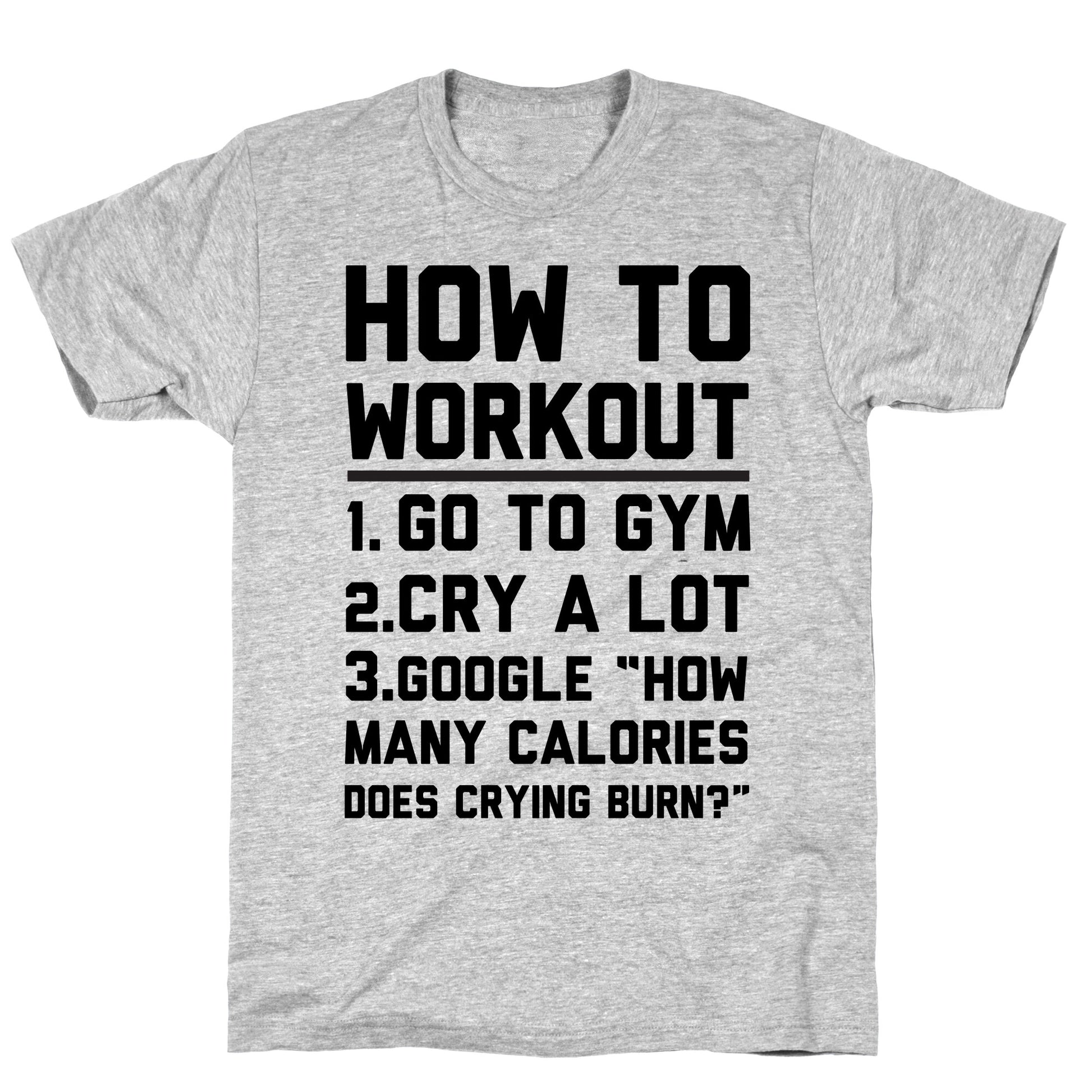 This funny fitness shirt is great for those lazy gym goers who want to get fit and only know one funny way "how to workout: 1. go to gym 2. cry a lot 3. google "how many calories does crying burn?" This funny gym shirt is perfect for fans of fitness memes, workout shirts, workout quotes, workout jokes, fitness shirts, and workout shirts. Our fitted Unisex Cotton tee is made from an exceedingly soft 100% ring spun cotton. It features a crew neckline with hemmed sleeves and bottom for durability. Preshrunk for your convenience! Printed in the USA. Made with 100% Ring Spun Cotton. Athletic Gray is made up of 90% cotton and 10% polyester. Other heathered colors are made of 52% cotton and 48% polyester.