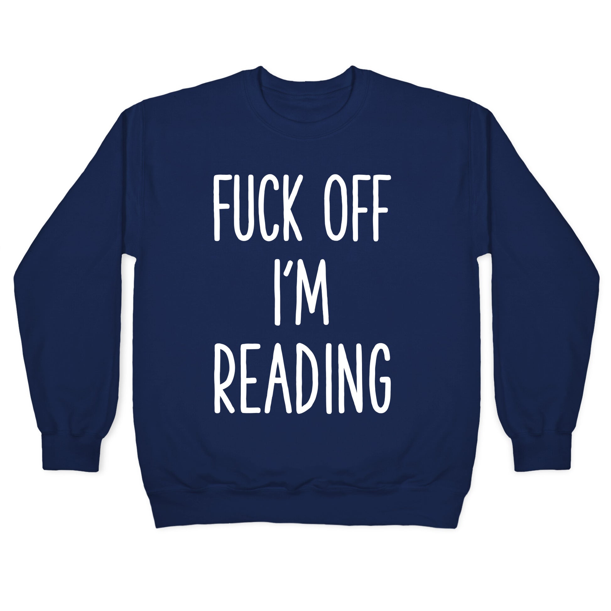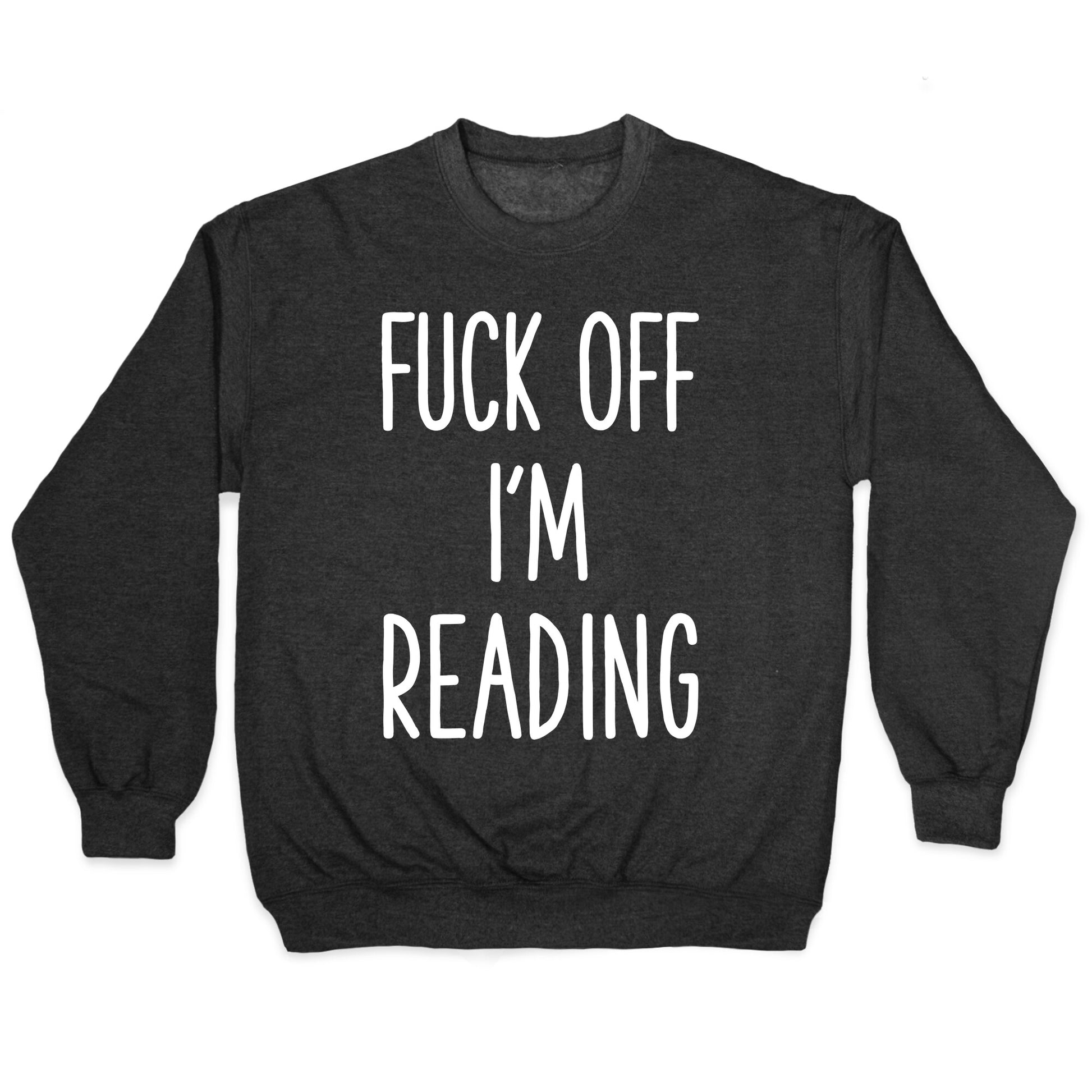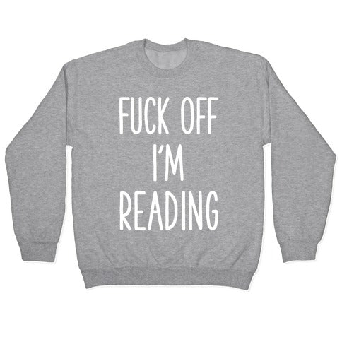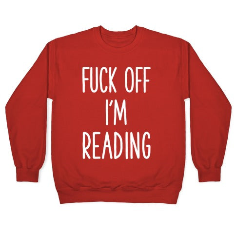 Tell people to leave you alone with this sassy book lover's shirt. This literature nerd shirt features the phrase "Fuck Off I'm Reading." Perfect for long bus rides when you don't want to talk to a random stranger.Our Unisex Crewneck Sweatshirt is made from a soft 8-ounce fabric, and they feature a crew neck, with sleeve and bottom hems for durability. Great for layering. Preshrunk for your convenience! Printed in the USA. Made with 50% Cotton and 50% Polyester.