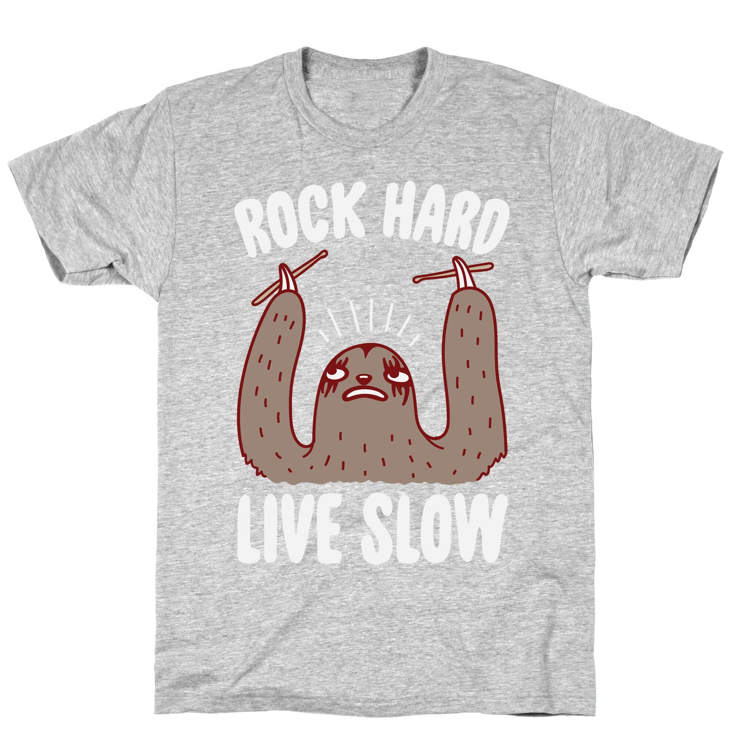 This cute and funny metal sloth shirt reads, "Rock Hard, Live Slow" and features one badass sloth getting ready to rock out! Rock out but not too fast, in this funny heavy metal tee! Our fitted Unisex Cotton tee is made from an exceedingly soft 100% ring spun cotton. It features a crew neckline with hemmed sleeves and bottom for durability. Preshrunk for your convenience! Printed in the USA. Made with 100% Ring Spun Cotton. Athletic Gray is made up of 90% cotton and 10% polyester. Other heathered colors are made of 52% cotton and 48% polyester.