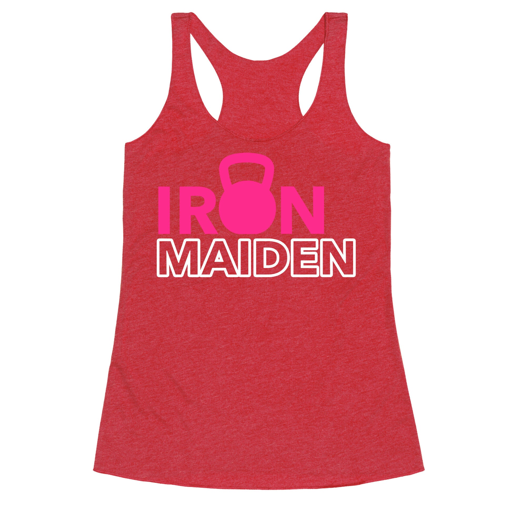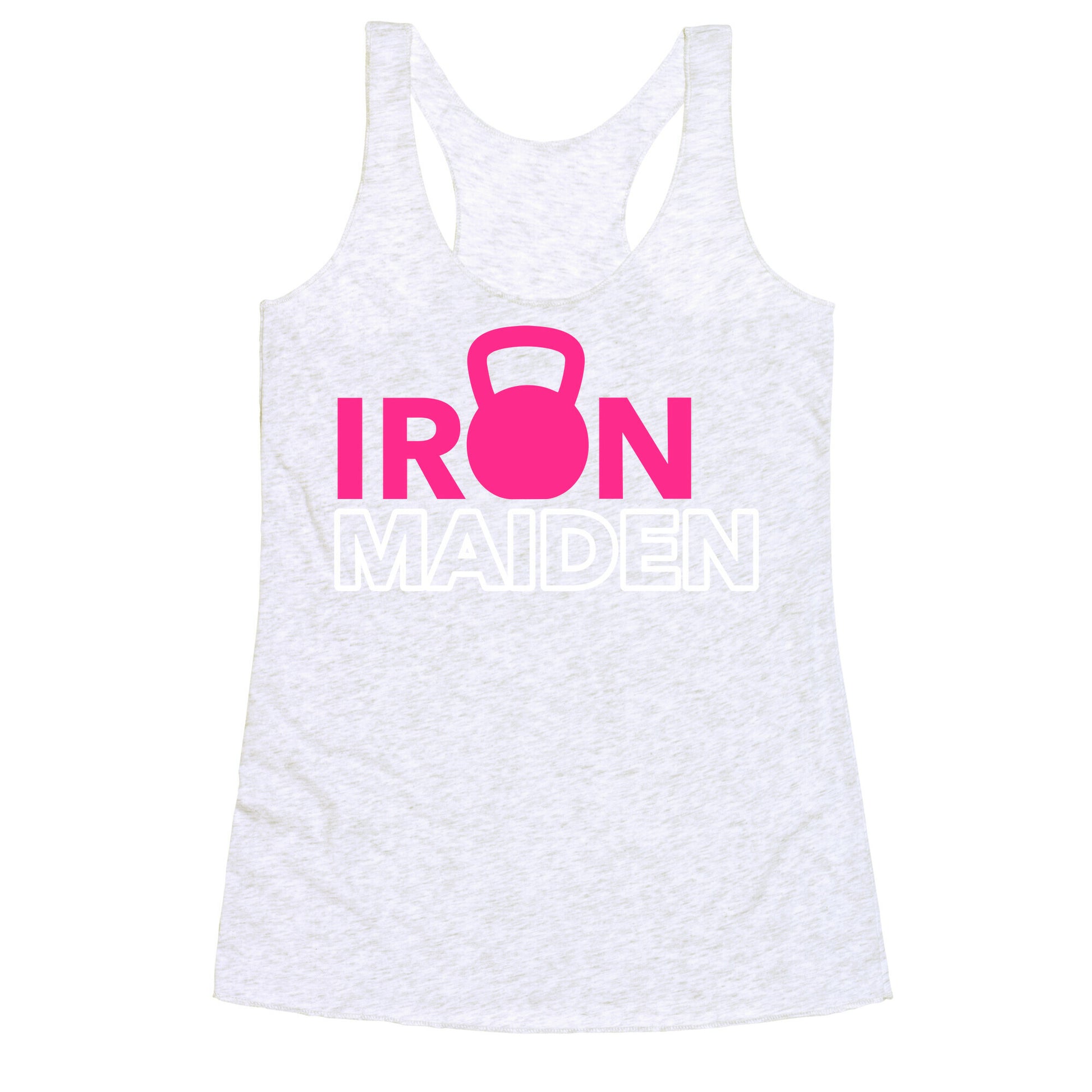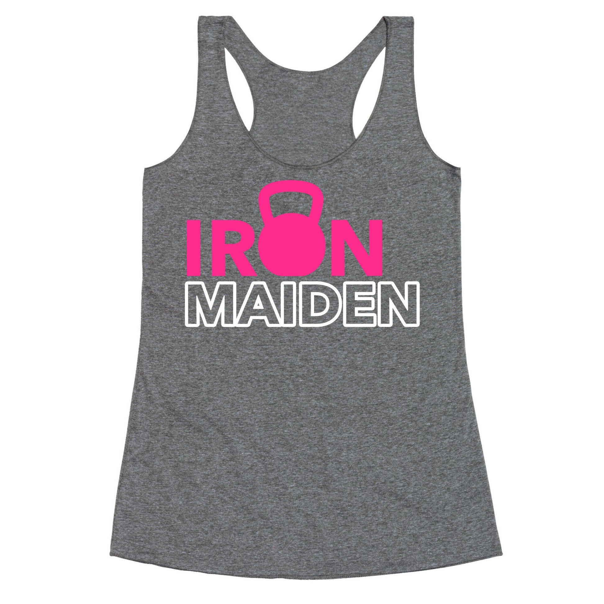 Shirt reads "Iron Maiden" with a kettlebell in place of the "o". Our super comfortable Women’s Raw Edge Racerback features a soft tri-blend, unhemmed fabric, with a fashionable bell-like shape for the bottom. Preshrunk for your convenience! Printed in the USA. Made with 50% Polyester 25% Ring Spun Cotton, and 25% Rayon.