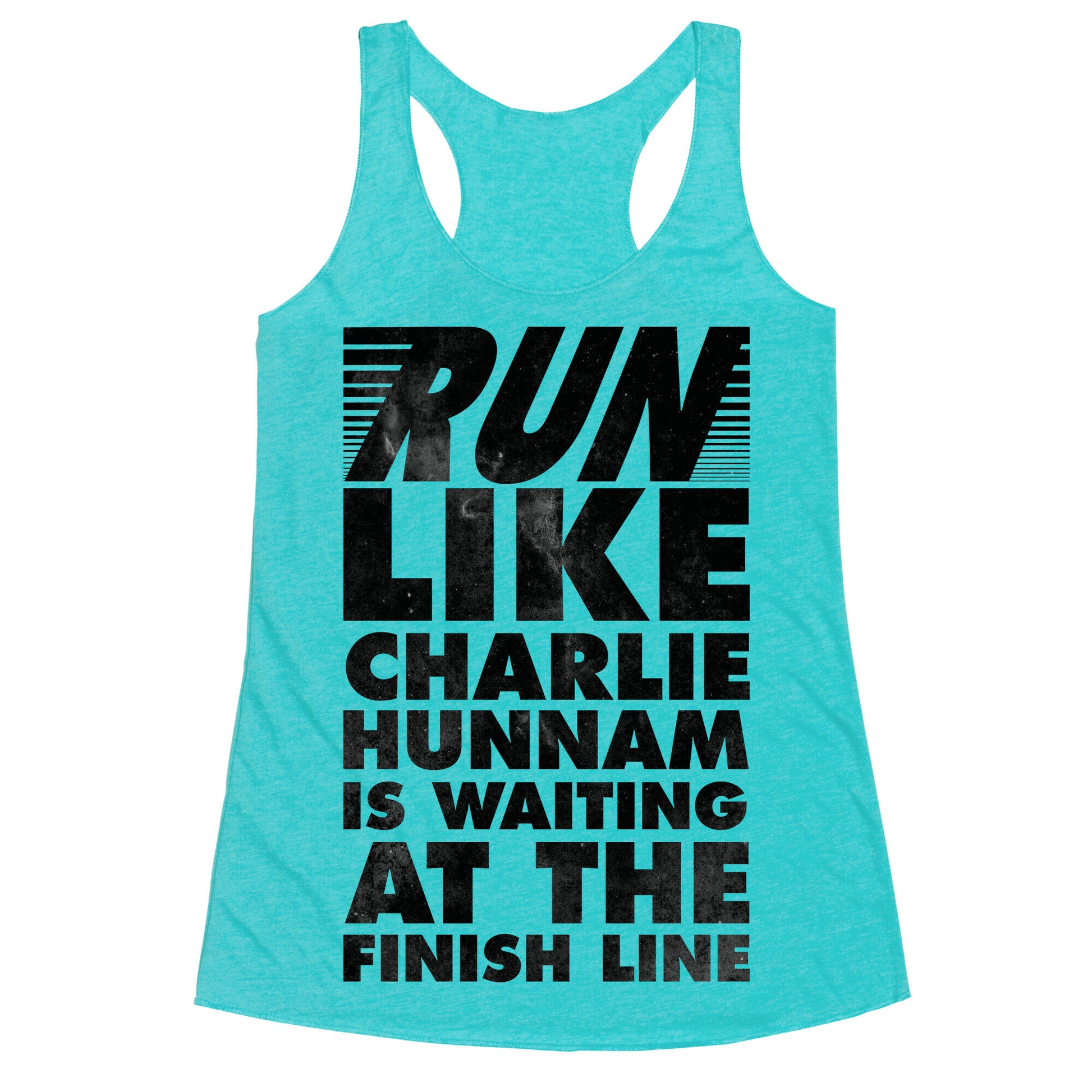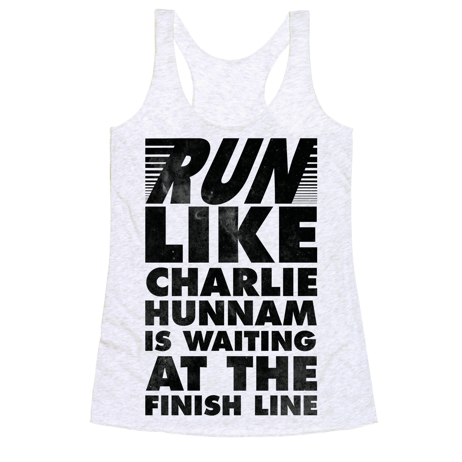 Allow the idea of Charlie Hunnam waiting for you to cross the finish line motivate you through your next run with this workout design.Our super comfortable Women’s Raw Edge Racerback features a soft tri-blend, unhemmed fabric, with a fashionable bell-like shape for the bottom. Preshrunk for your convenience! Printed in the USA. Made with 50% Polyester 25% Ring Spun Cotton, and 25% Rayon.