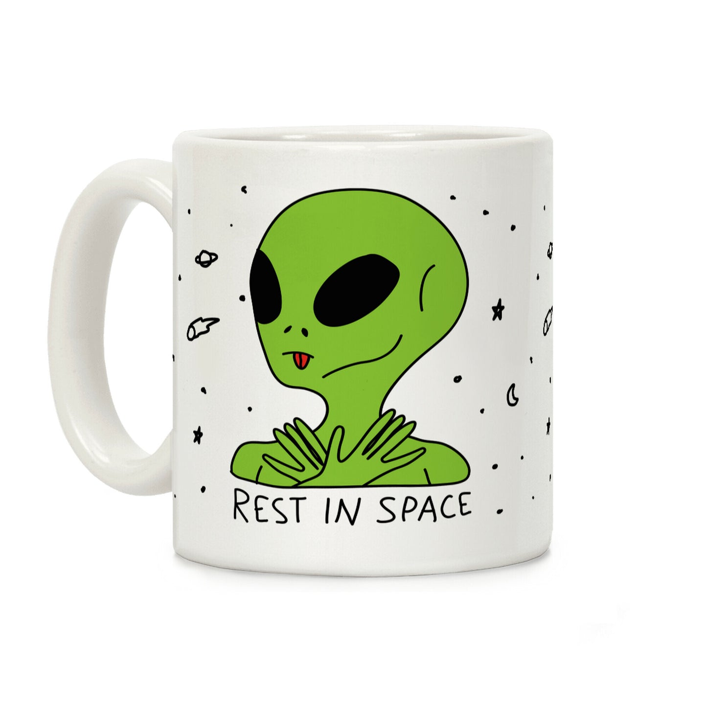 Show off your weird and quirky side with this alien believer's, space lover's, R.I.P. parody coffee mug! Rest in peace? More like rest in space with your fellow alien brethren!
