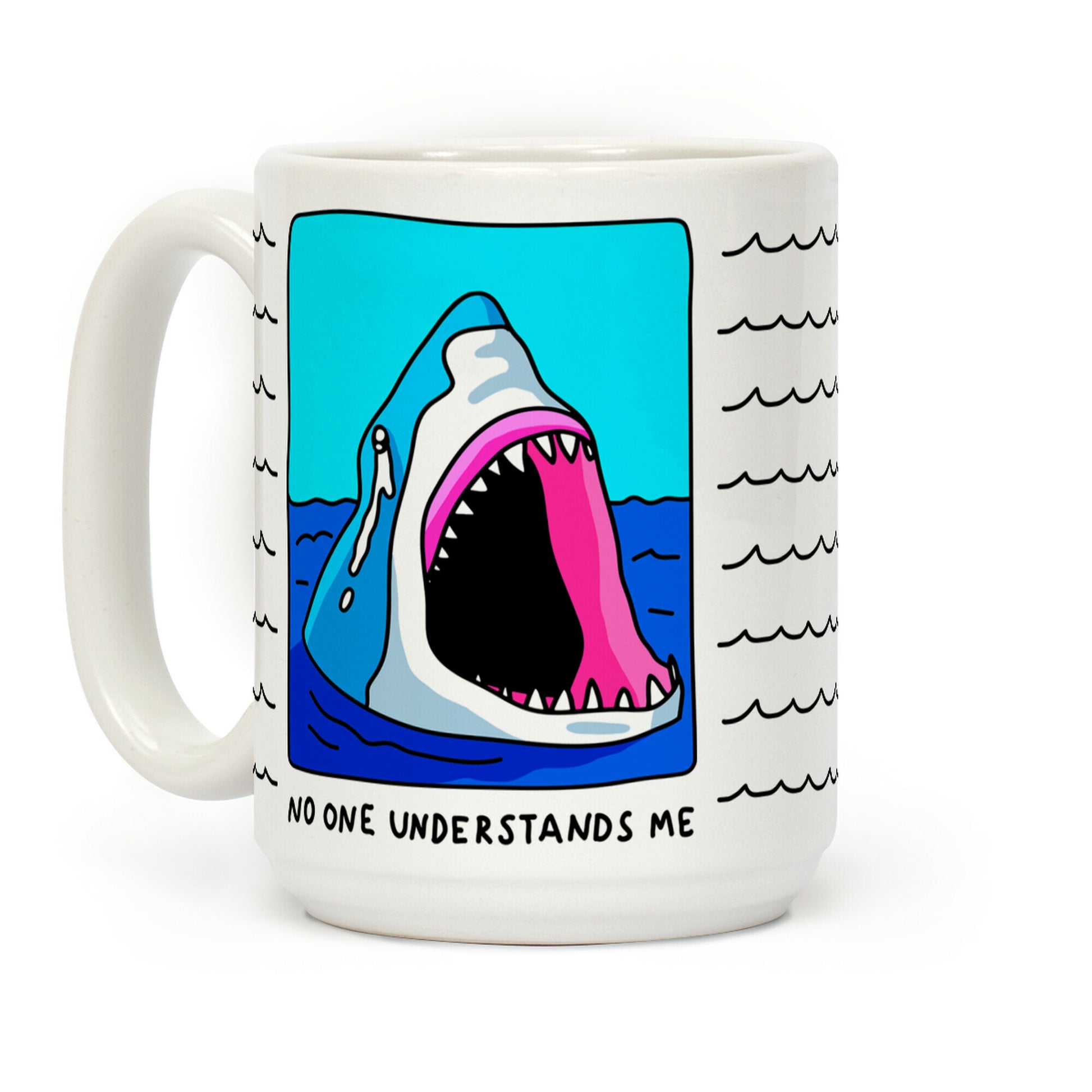 Show off your emotional and angsty side with this sad but adorable, underwater, comic inspired, misunderstood shark coffee mug! Let the world know that sharks are totally gentle creatures, and that they are simply misunderstood! Our Mug features large handles for easy gripping and a wrap-around print. These heavy-duty Mugs are both dishwasher and microwave safe. Printed in the USA.