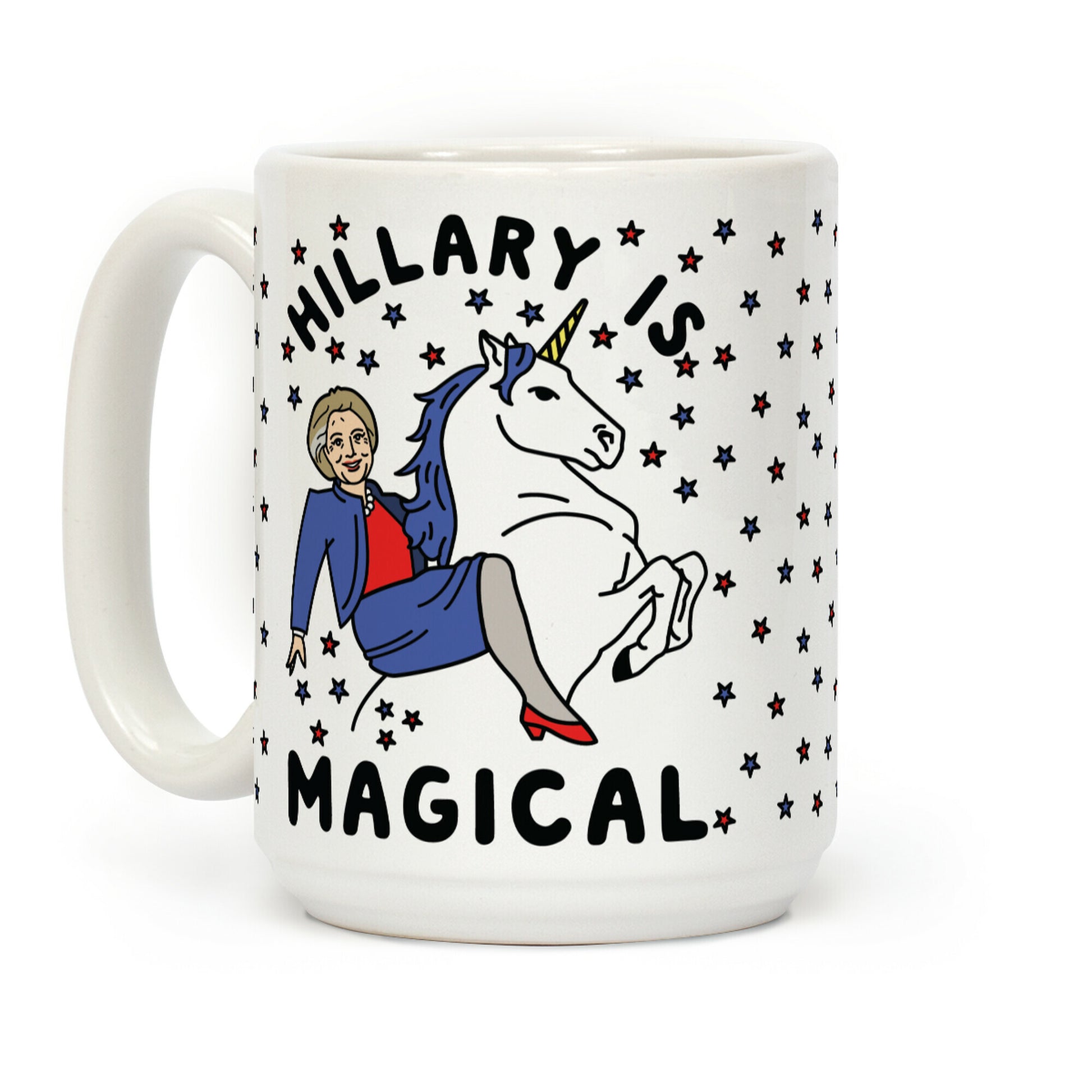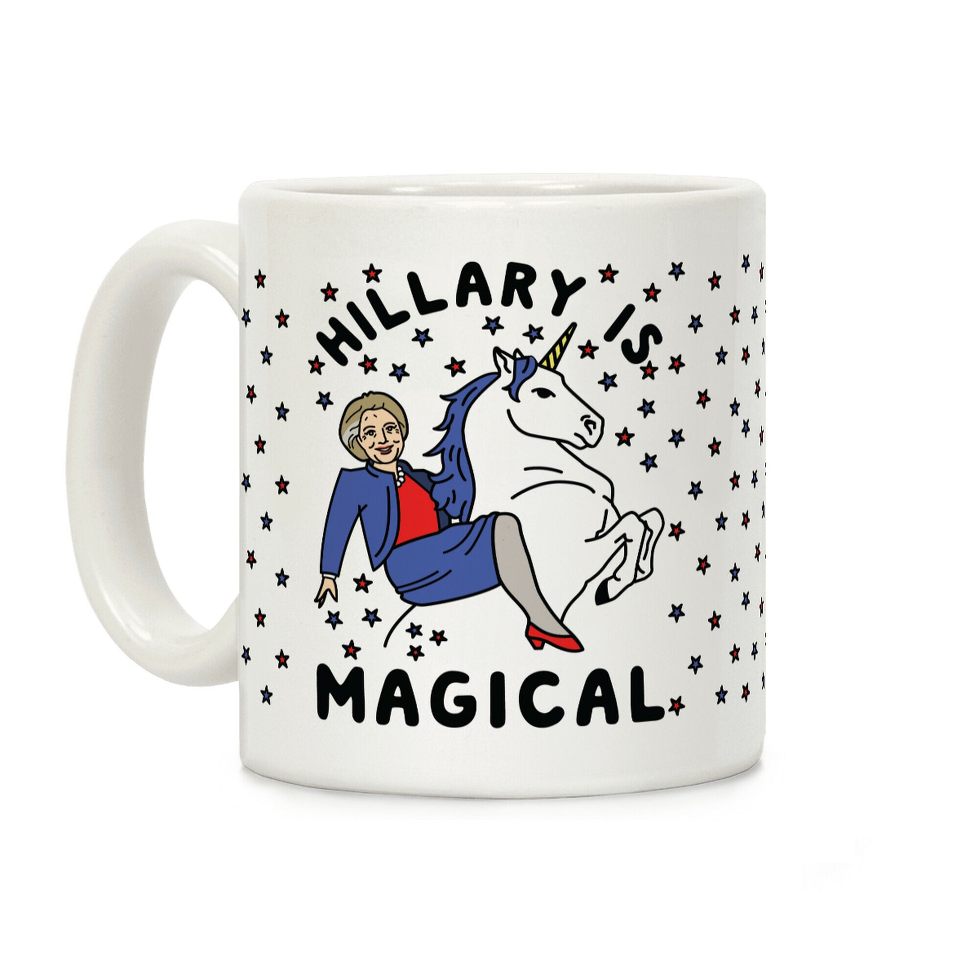 Show your love for the magical Hillary Rodham Clinton with this funny political coffee mug. This mug features an illustration of Hillary riding a Unicorn and the phrase "Hillary Is Magical."