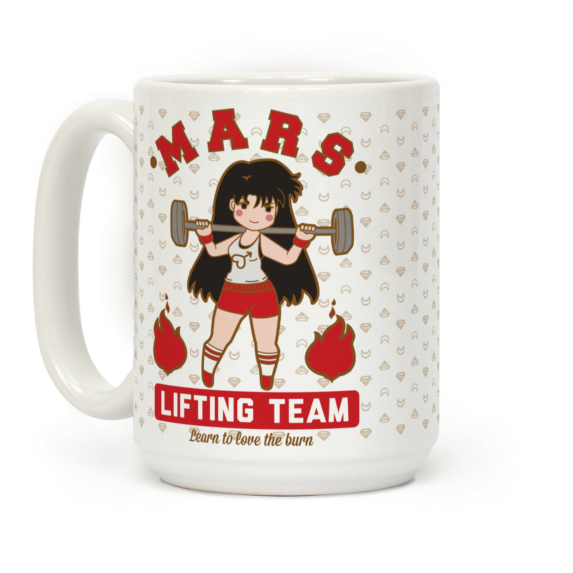Wake up and get swol with Rei Hino in this Sailor Mars Parody design! Join the Mars lifting team and channel the Sailor Scout's strength into your next workout. This mug features an illustration of Raye working out and the phrase "Mars Lifting Team, Learn to Love the Burn." Our Mug features large handles for easy gripping and a wrap-around print. These heavy-duty Mugs are both dishwasher and microwave safe. Printed in the USA.