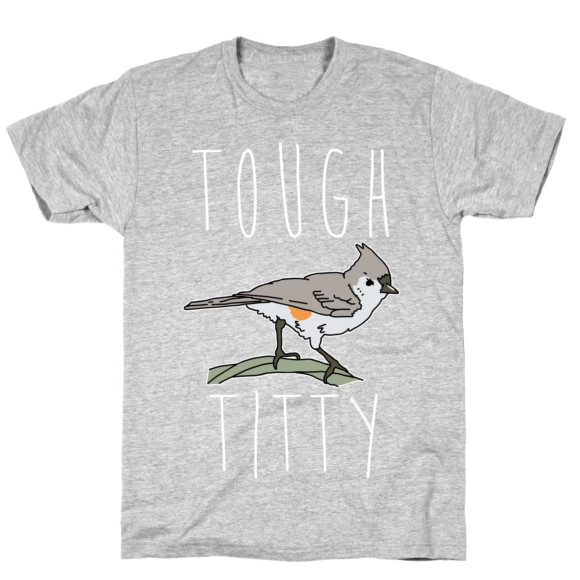 Show that you're a pun loving bird enthusiast with this cute design. This bird design features an illustration of a tufted titmouse and the phrase "Tough Titty." Our fitted Unisex Cotton tee is made from an exceedingly soft 100% ring spun cotton. It features a crew neckline with hemmed sleeves and bottom for durability. Preshrunk for your convenience! Printed in the USA. Made with 100% Ring Spun Cotton. Athletic Gray is made up of 90% cotton and 10% polyester. Other heathered colors are made of 52% cotton and 48% polyester.