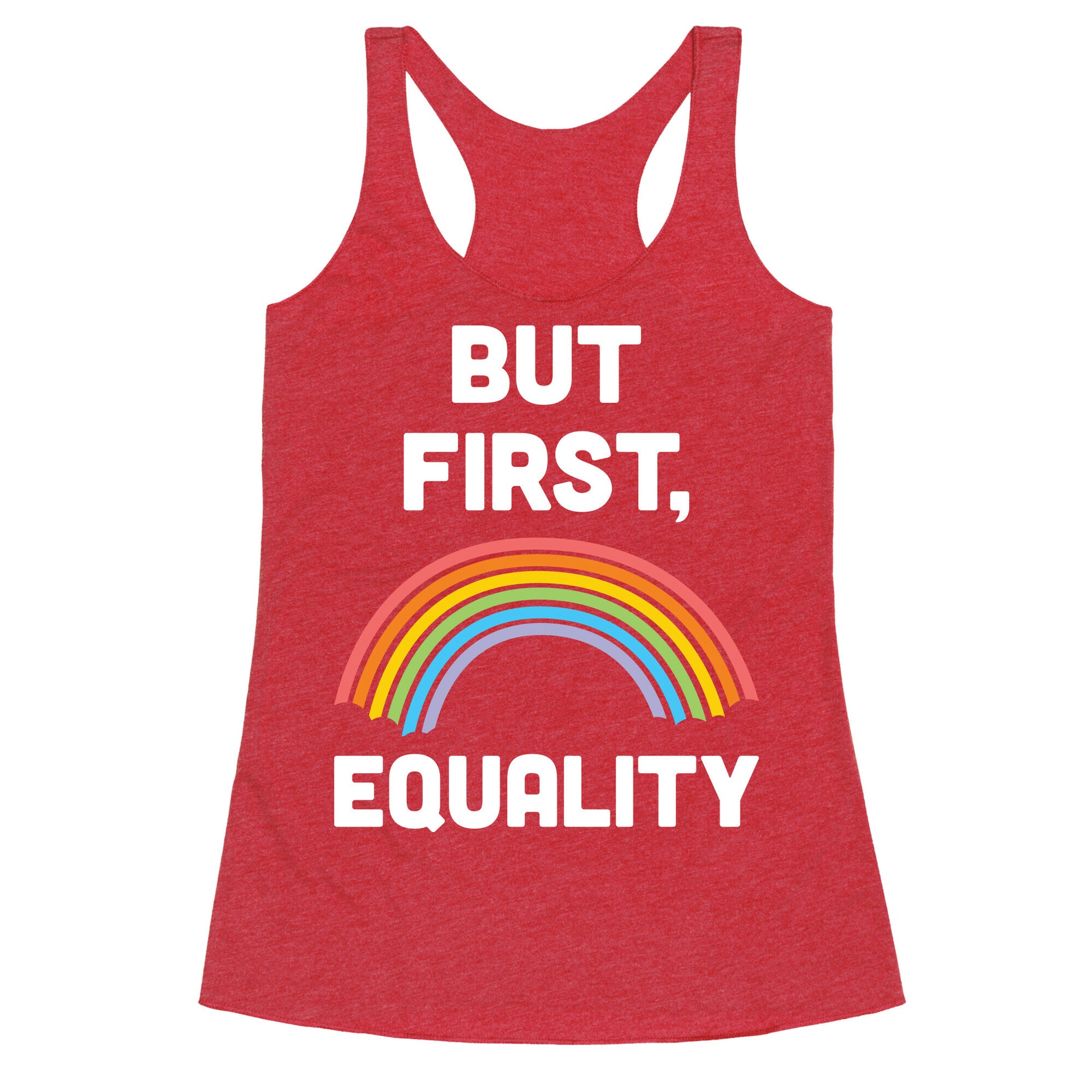Show off your pride and stand up for equality with this "But First, Equality" rainbow design! Perfect for gay pride, LGBTQ rights, human rights, queer pride, and fighting for justice and equality! Our super comfortable Women’s Raw Edge Racerback features a soft tri-blend, unhemmed fabric, with a fashionable bell-like shape for the bottom. Preshrunk for your convenience! Printed in the USA. Made with 50% Polyester 25% Ring Spun Cotton, and 25% Rayon.