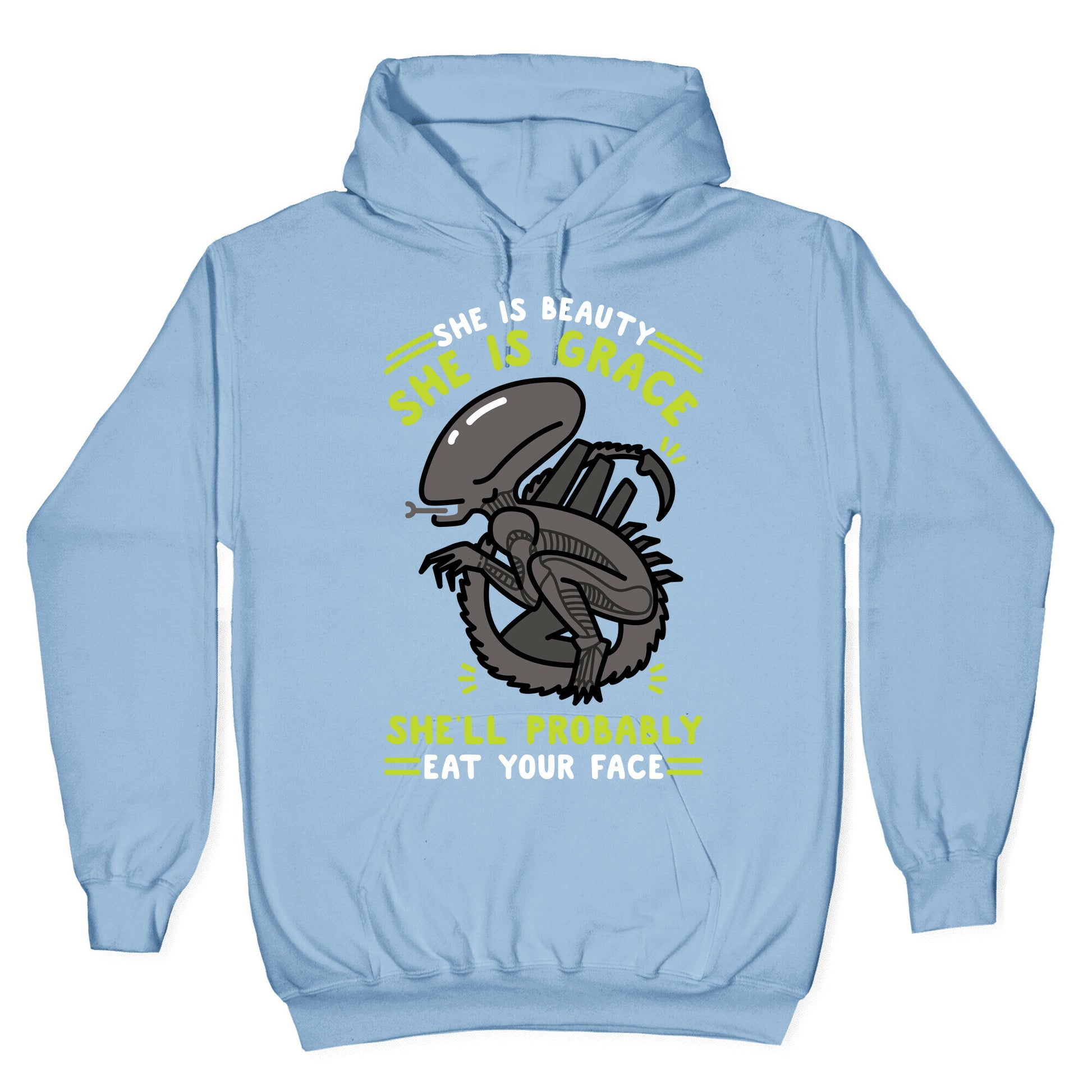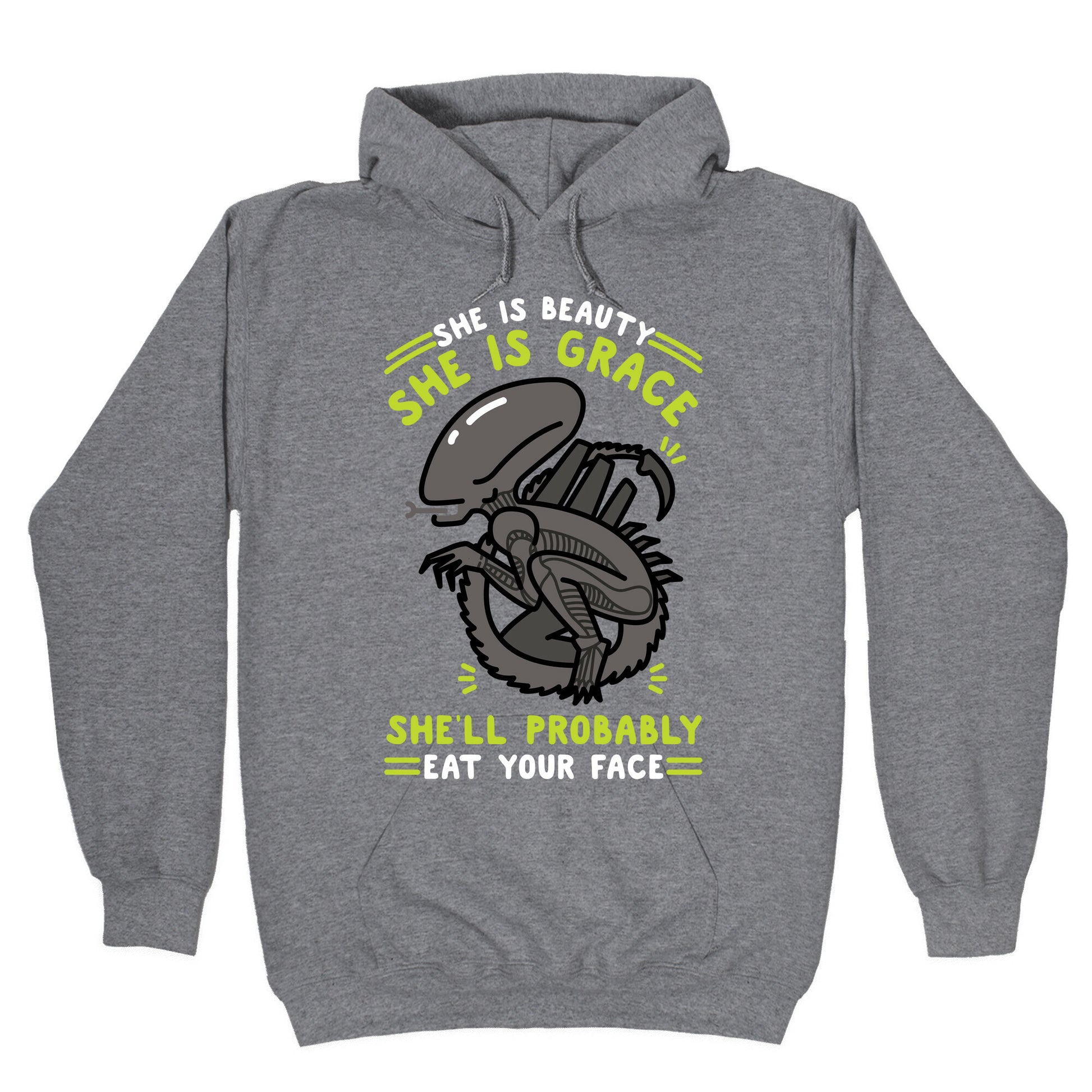 She is Beauty She is Grace, She'll Probably Eat Your Face. Show your love of Alien and Xenomorphs with this nerdy sci-fi parody design Our Unisex Pullover Hoodie is made from a soft 8-ounce fabric They feature a drawstring hood and front kangaroo pocket. Great for layering! Preshrunk for your convenience! Printed in the USA. Made with 50% Cotton and 50% Polyester.