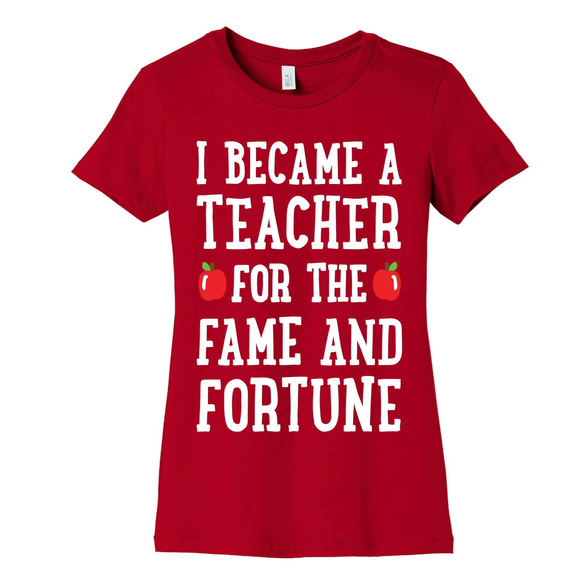 Show off your love of teaching with this sarcastic teacher humor, school inspired shirt! Let your classroom know that you decided on this profession for the fame and fortune! Just kidding of course, teachers are not paid enough AT ALL.Our slim fit Women’s Cotton Tees, are made with exceedingly soft 100% cotton. They feature a relaxed neckline, and the sleeves and bottom, are hemmed for durability. Preshrunk for your convenience! Printed in the USA. Made with 100% Cotton. Colors such as gray, is made up of 90% cotton and 10% polyester, and deep pink is made up of 50% cotton and 50% polyester.
