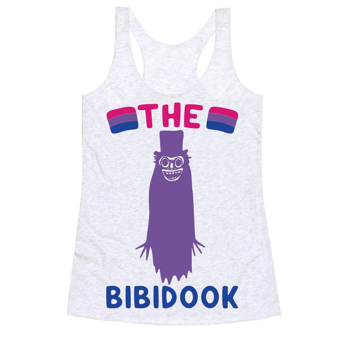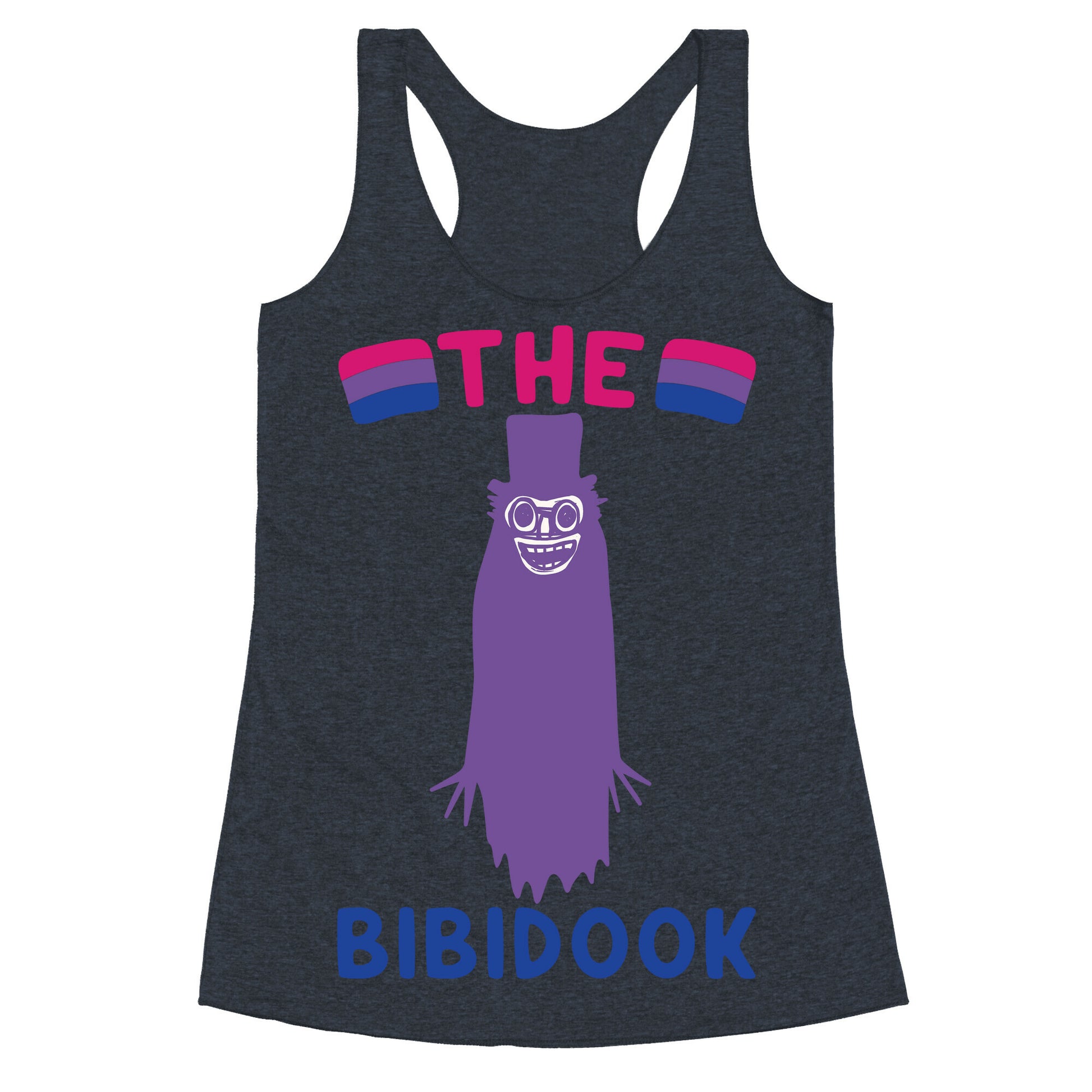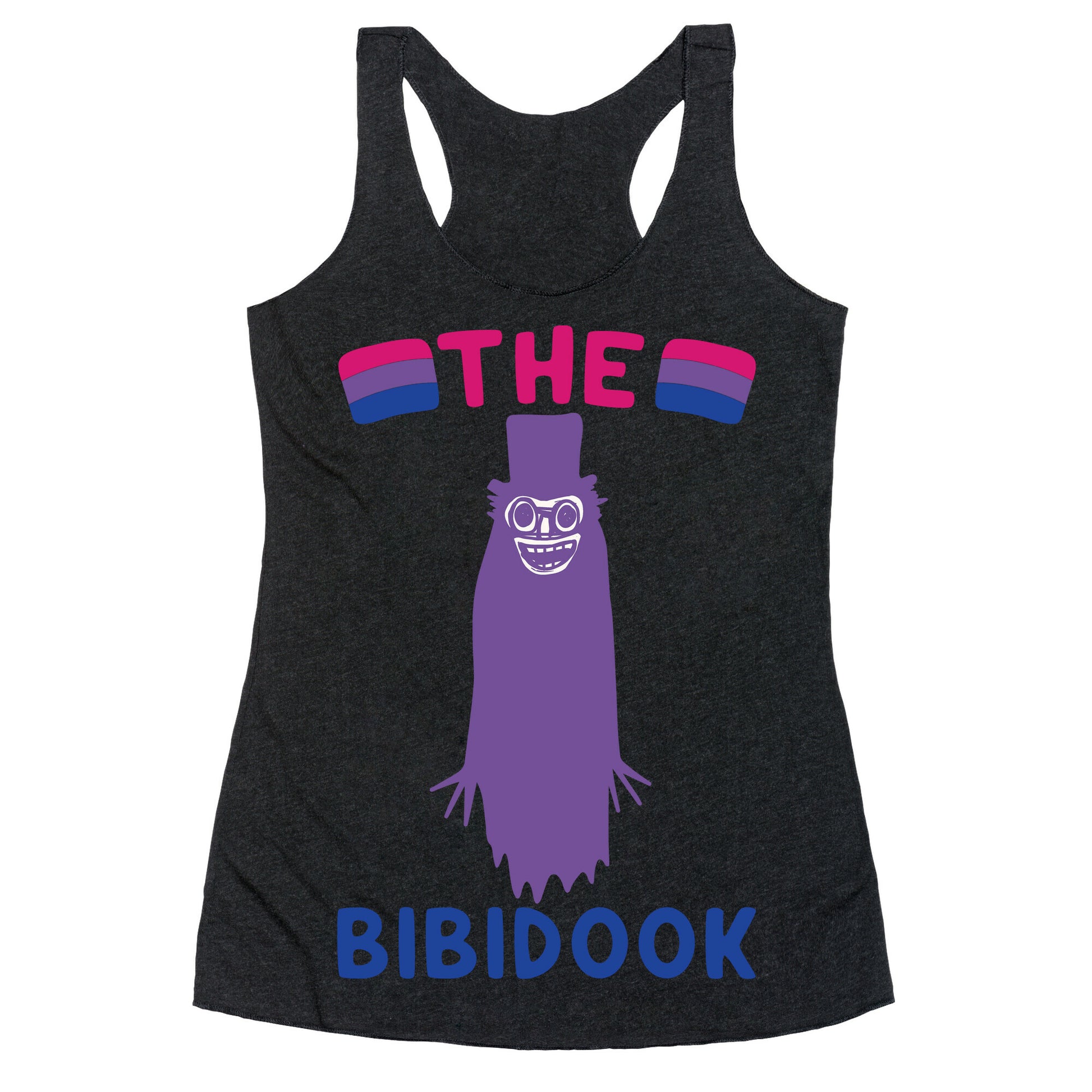 The babadook is now a queer icon! So celebrate your bisexual pride with this new bisexual version of the babadook, the bibidook! Celebrate your bi pride with this funny, babadook, bisexual parody shirt!Our super comfortable Women’s Raw Edge Racerback features a soft tri-blend, unhemmed fabric, with a fashionable bell-like shape for the bottom. Preshrunk for your convenience! Printed in the USA. Made with 50% Polyester 25% Ring Spun Cotton, and 25% Rayon.