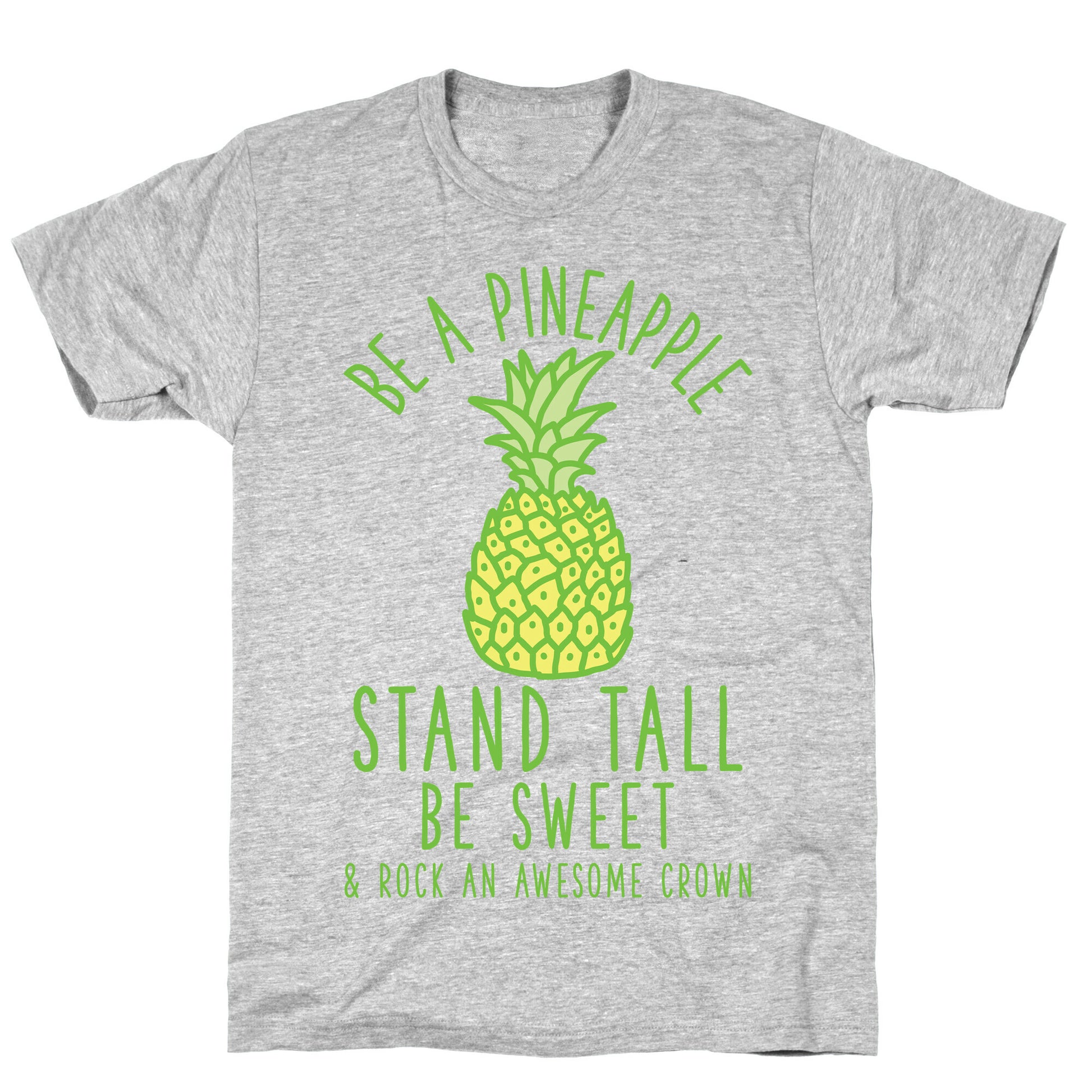 Be a pineapple: Stand tall, be sweet, rock an awesome crown. Channel your inner pineapple with this cute funny design. Our fitted Unisex Cotton tee is made from an exceedingly soft 100% ring spun cotton. It features a crew neckline with hemmed sleeves and bottom for durability. Preshrunk for your convenience! Printed in the USA. Made with 100% Ring Spun Cotton. Athletic Gray is made up of 90% cotton and 10% polyester. Other heathered colors are made of 52% cotton and 48% polyester.