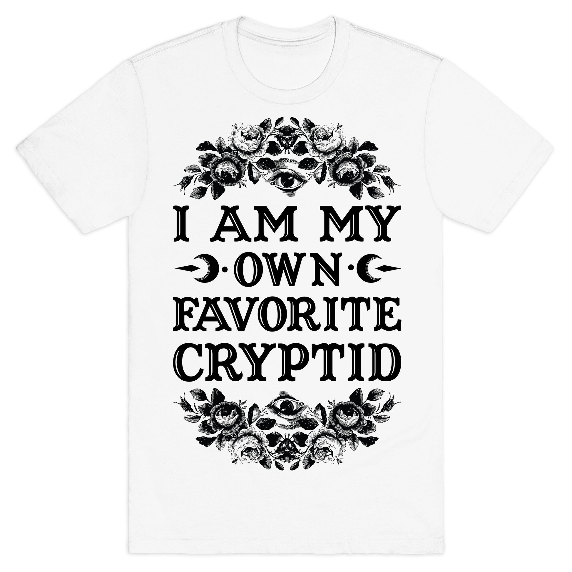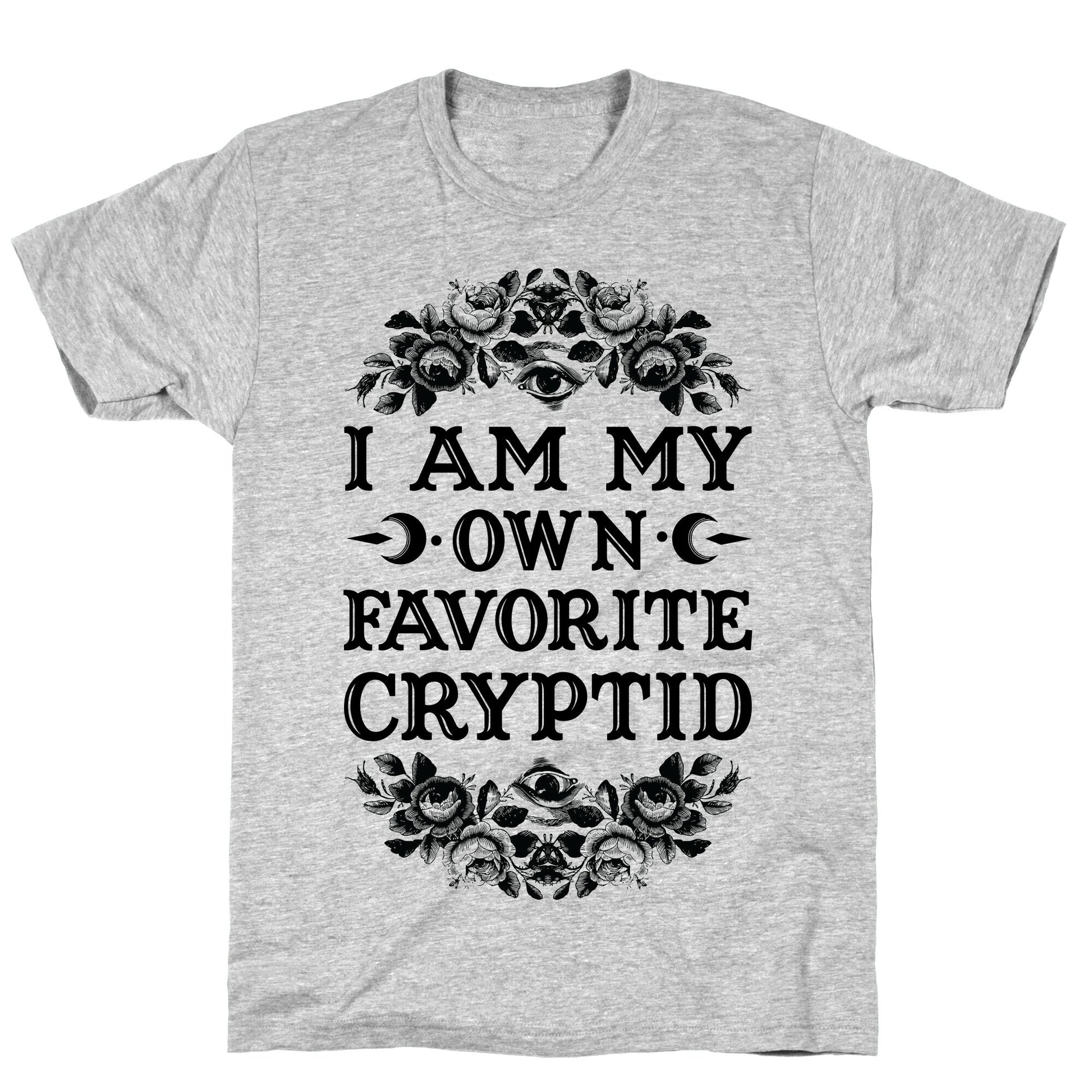 Be the lurking cryptid you want to see in the world. This funny cryptid themed shirt features illustrations of flowers, eyeballs and the phrase "I am my own favorite cryptid." Our fitted Unisex Cotton tee is made from an exceedingly soft 100% ring spun cotton. It features a crew neckline with hemmed sleeves and bottom for durability. Preshrunk for your convenience! Printed in the USA. Made with 100% Ring Spun Cotton. Athletic Gray is made up of 90% cotton and 10% polyester. Other heathered colors are made of 52% cotton and 48% polyester.