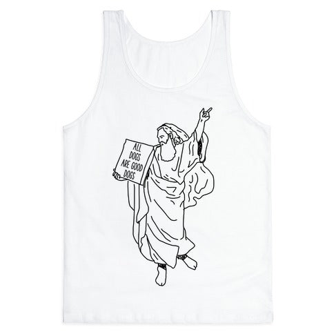 All dogs are good dogs. Show that all dogs go to heaven with this illustration of Moses descending mont Sinai with a tablet that says "All Dogs are Good Dogs."Our relaxed Unisex tanks, are made with exceedingly soft 100% ring spun cotton. They feature a rounded and hemmed neckline with wide comfortable straps. Preshrunk for your convenience! Printed in the USA. Made with 100% Ring Spun Cotton. Colors such as pink, grey, and blue are made with 50% poly 25% ring spun cotton and 25% Rayon.