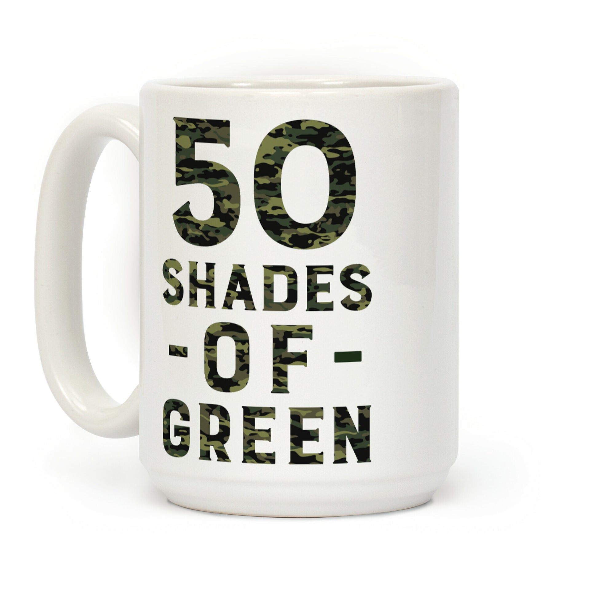 Who needs 50 Shades of Grey when you have 50 Shades of Green? Show your Army Wife pride with this design. Our Mug features large handles for easy gripping and a wrap-around print. These heavy-duty Mugs are both dishwasher and microwave safe. Printed in the USA