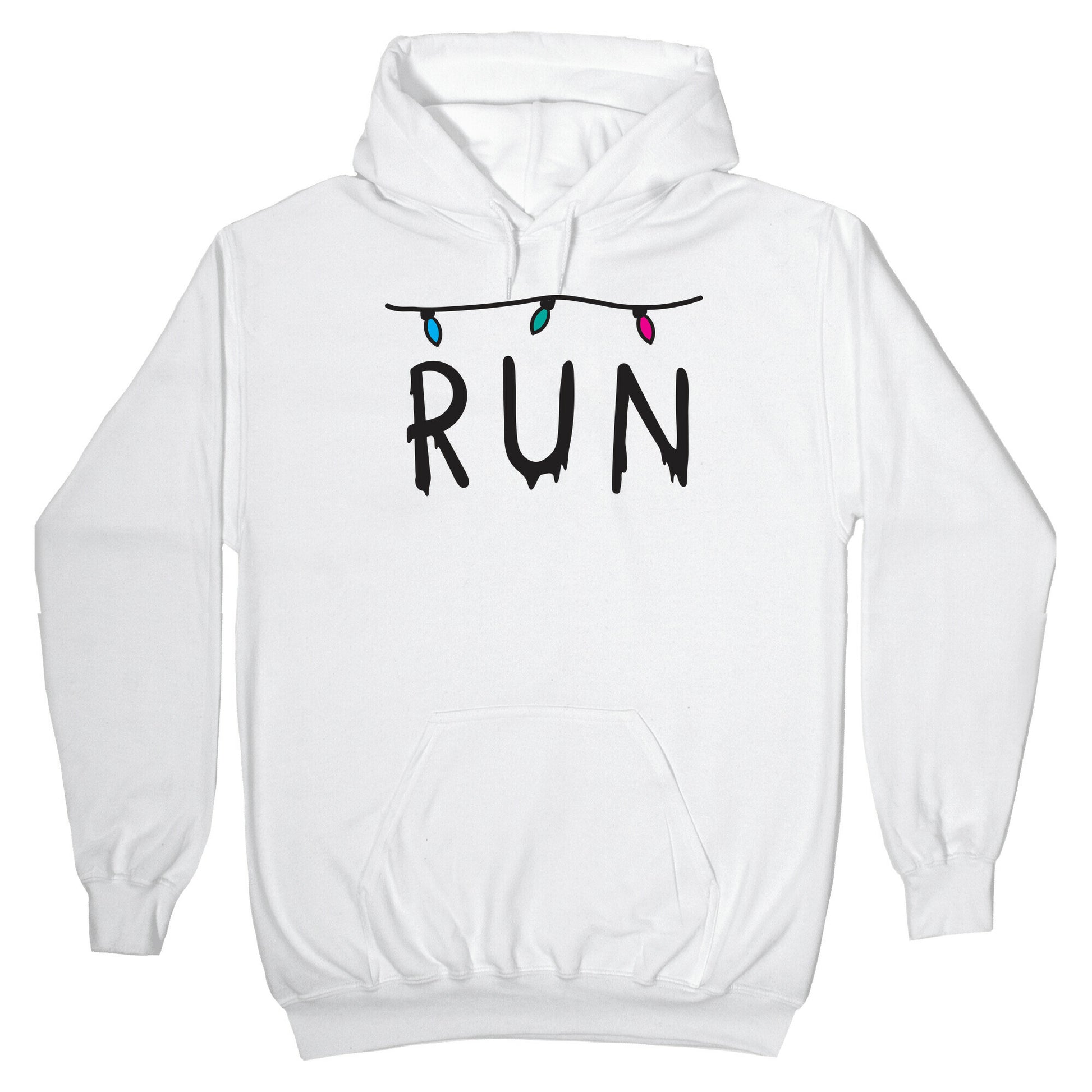 Get in shape to out run the demogorgon, demadogs, and shadow monster with this, "RUN" Stranger Things lights design! Perfect for cardio, running, Stranger Things fans, working out, fitness, and pop culture lovers! Our Unisex Pullover Hoodie is made from a soft 8-ounce fabric They feature a drawstring hood and front kangaroo pocket. Great for layering! Preshrunk for your convenience! Printed in the USA. Made with 50% Cotton and 50% Polyester.