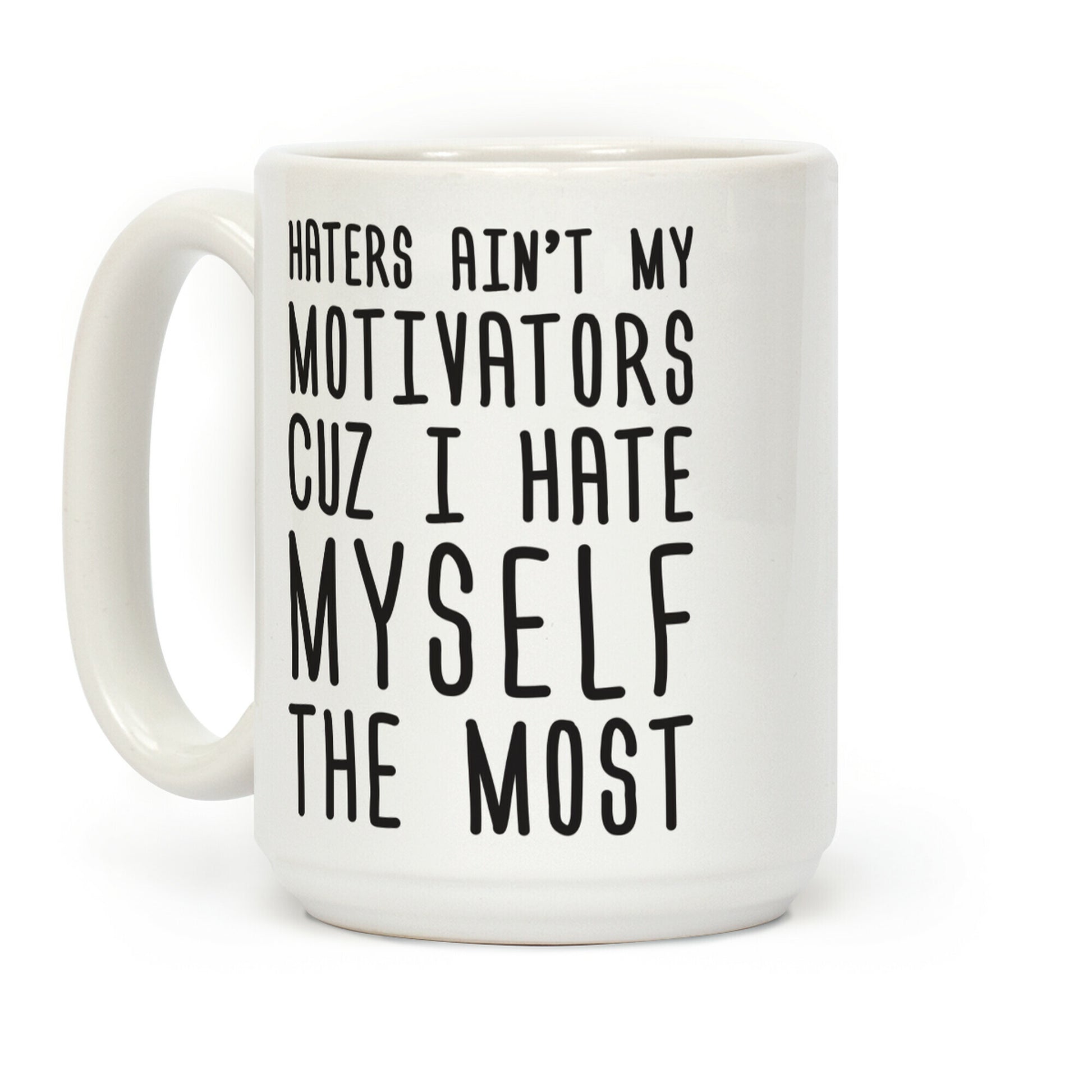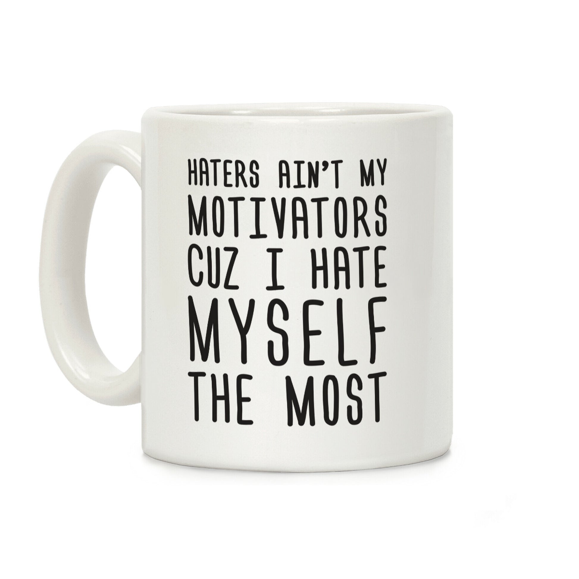 I don't care if you hate me because I do too! Show off your self deprecating dark humor with this funny, "Haters Ain't My Motivators Cuz I Hate Myself The Most" hater gear. Our Mug features large handles for easy gripping and a wrap-around print. These heavy-duty Mugs are both dishwasher and microwave safe. Printed in the USA.