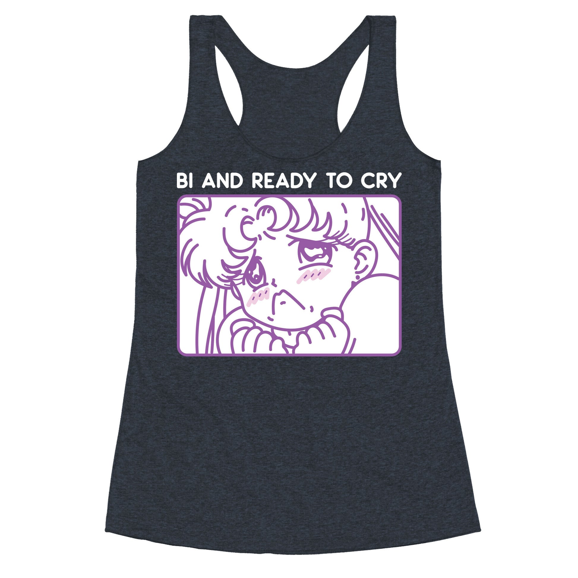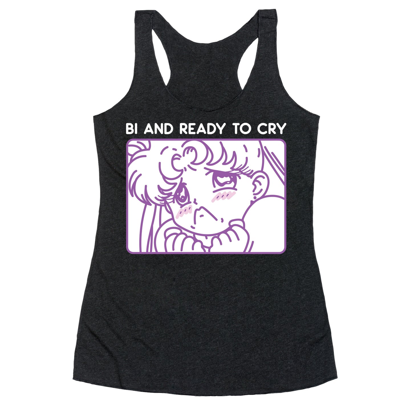 Celebrate your bisexuality and sensitive feelings with this funny, "Bi And Ready To Cry" kawaii, sailor moon design! Perfect for bi pride, sensitive souls, bisexual quotes, sailor scouts, and anime lovers! Our super comfortable Women’s Raw Edge Racerback features a soft tri-blend, unhemmed fabric, with a fashionable bell-like shape for the bottom. Preshrunk for your convenience! Printed in the USA. Made with 50% Polyester 25% Ring Spun Cotton, and 25% Rayon.