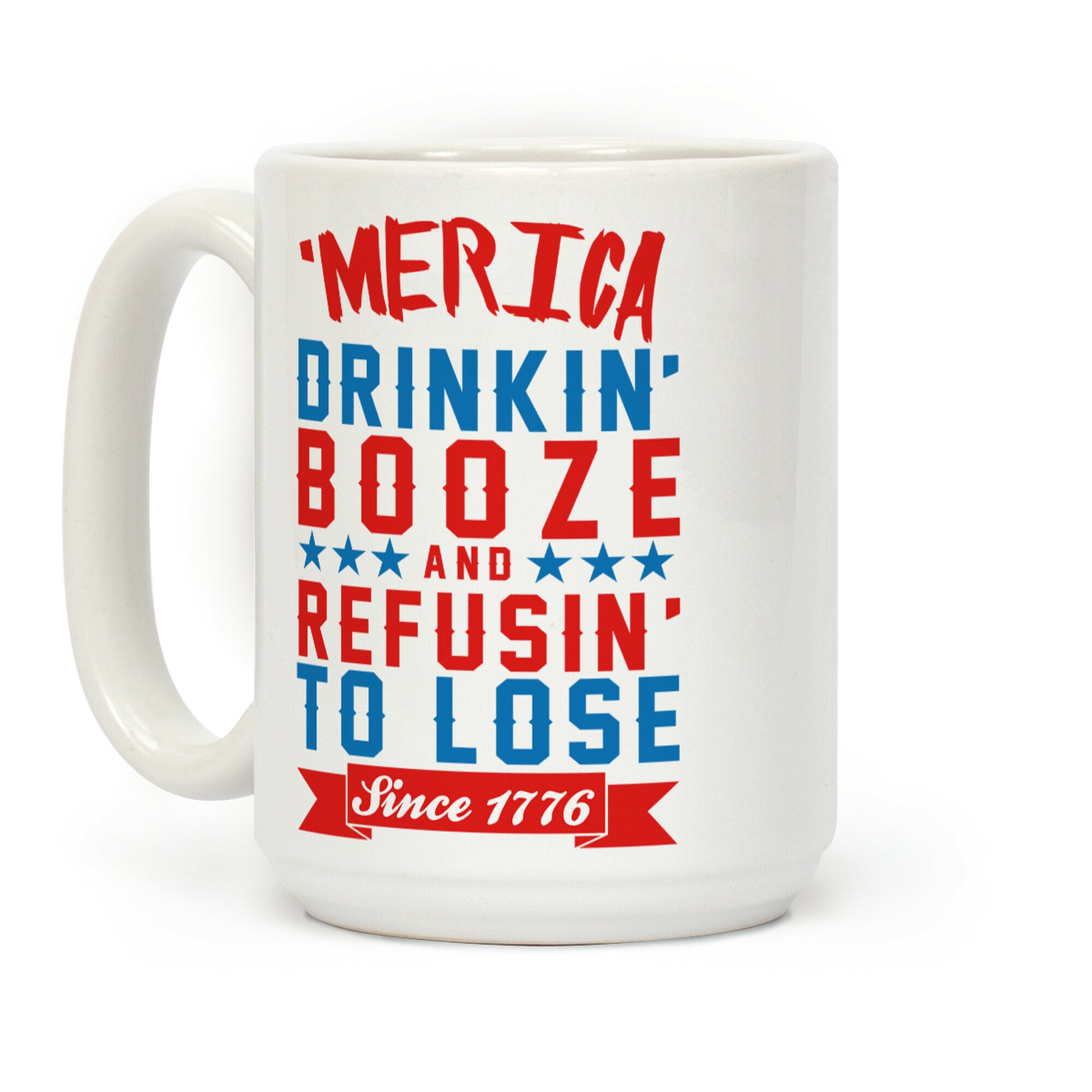 Get your 'merican pride on while you celebrate america's ass kicking ways while drinking a beer with this design that says "'Merica: Drinkin' Booze And Refusin' To Lose Since 1776".