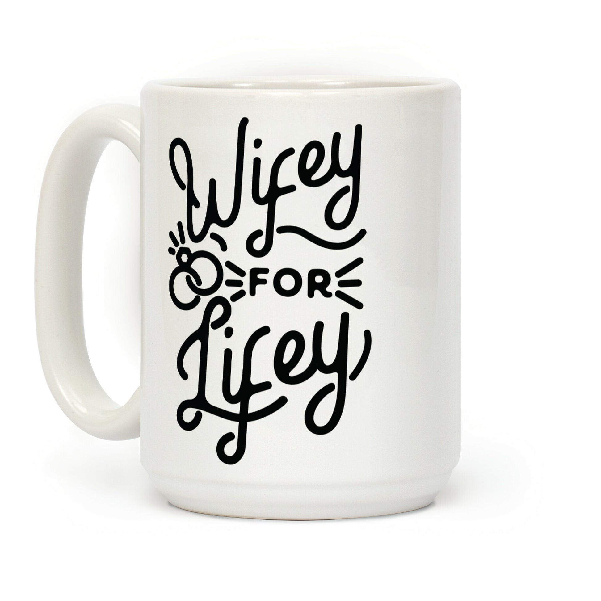 Wifey for Lifey. Show that you're getting hitched and staying that way with this cute bridal design. Our Mug features large handles for easy gripping and a wrap-around print. These heavy-duty Mugs are both dishwasher and microwave safe. Printed in the USA