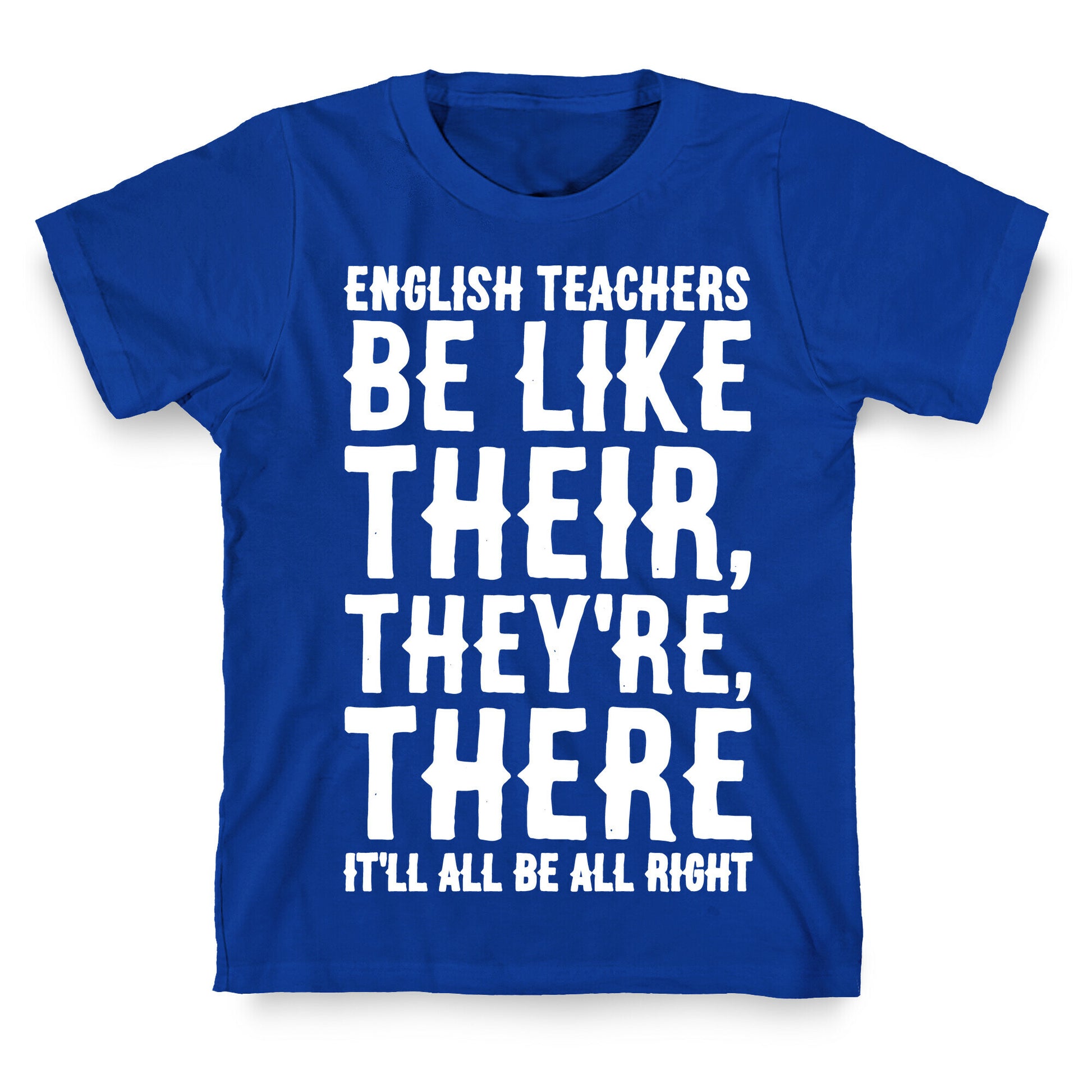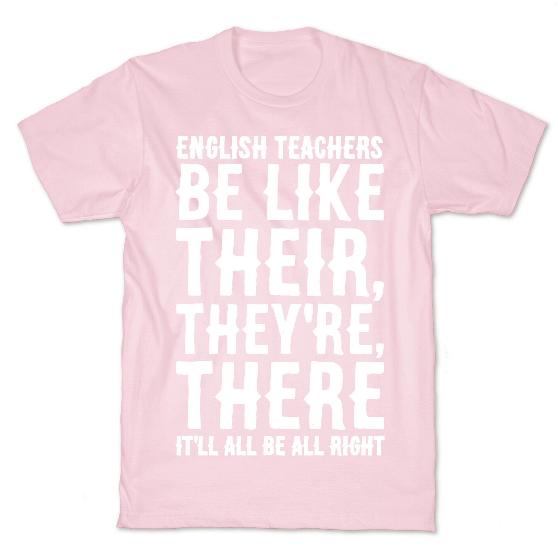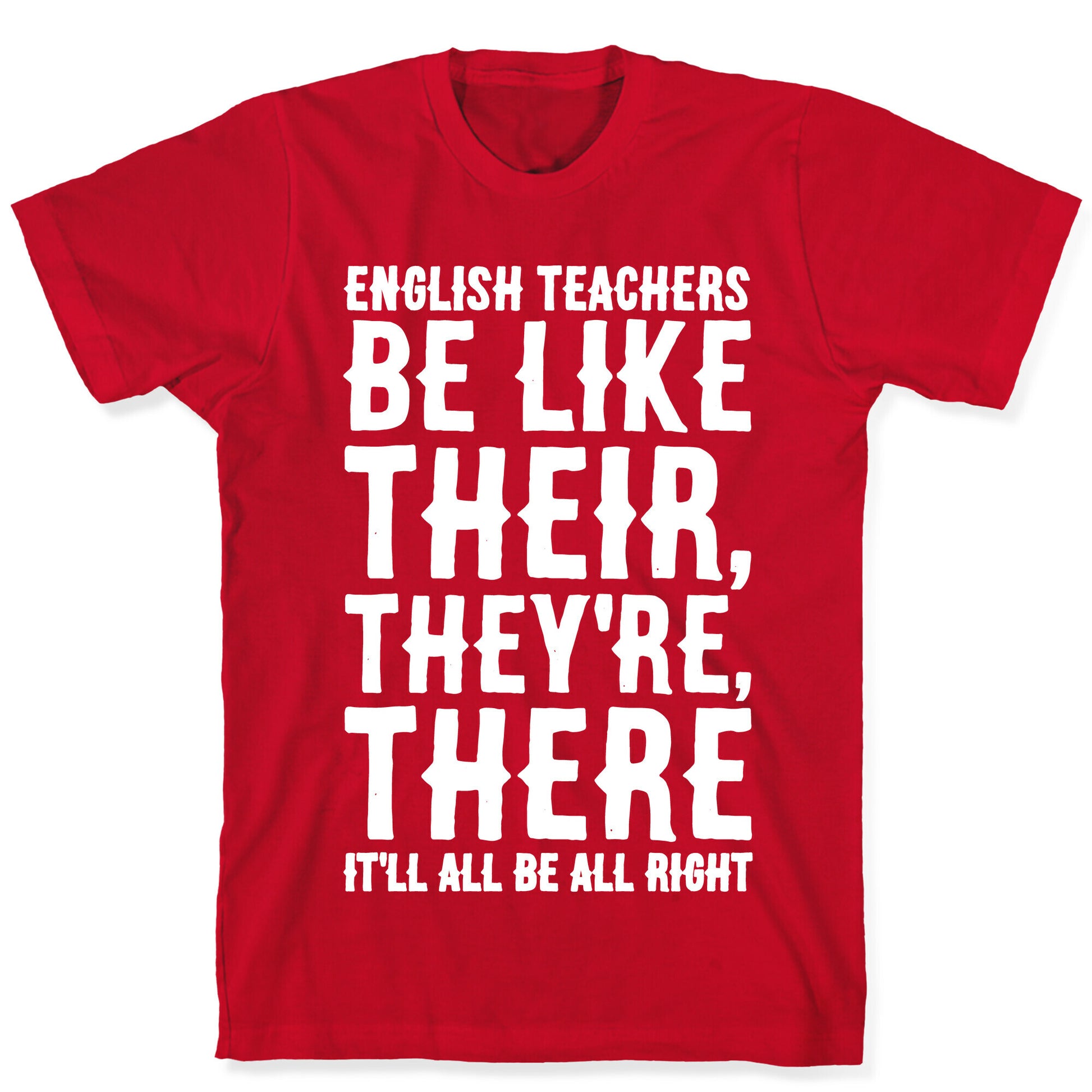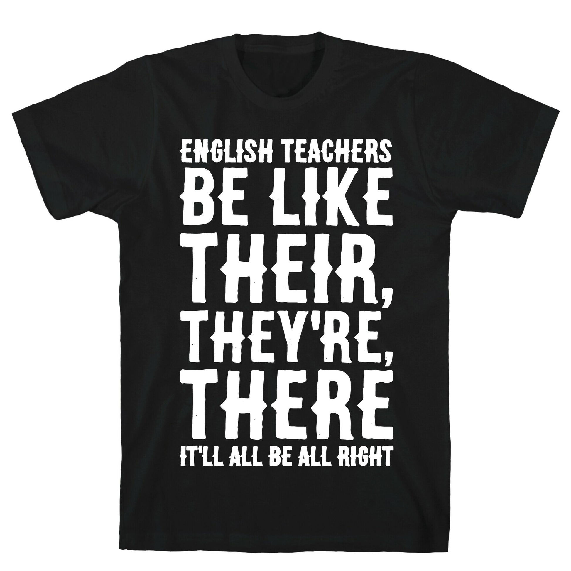 English teachers be like, Their, They're, There It'll all be all right! Show off your love for grammar and english teachers with this funny back to school, grammar, english teacher shirt. Our fitted Unisex Cotton tee is made from an exceedingly soft 100% ring spun cotton. It features a crew neckline with hemmed sleeves and bottom for durability. Preshrunk for your convenience! Printed in the USA. Made with 100% Ring Spun Cotton. Athletic Gray is made up of 90% cotton and 10% polyester. Other heathered colors are made of 52% cotton and 48% polyester.