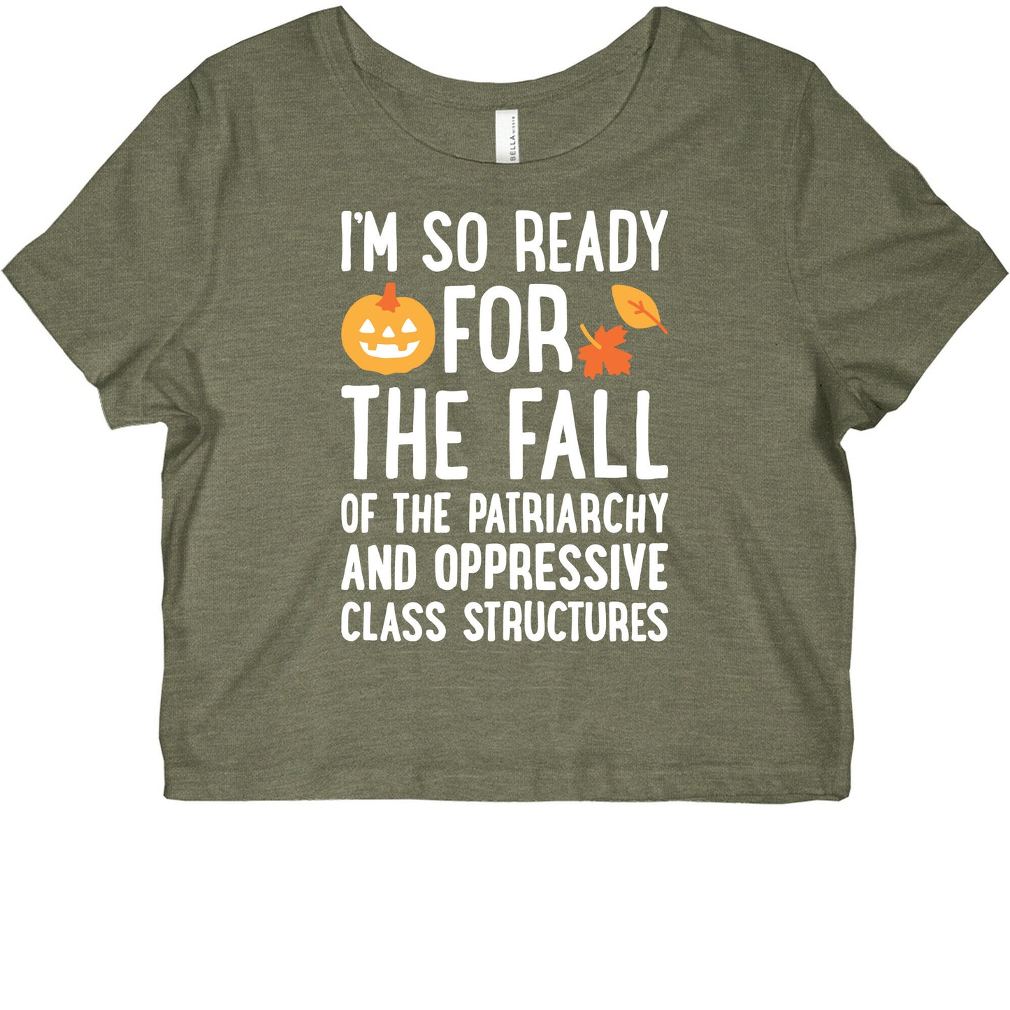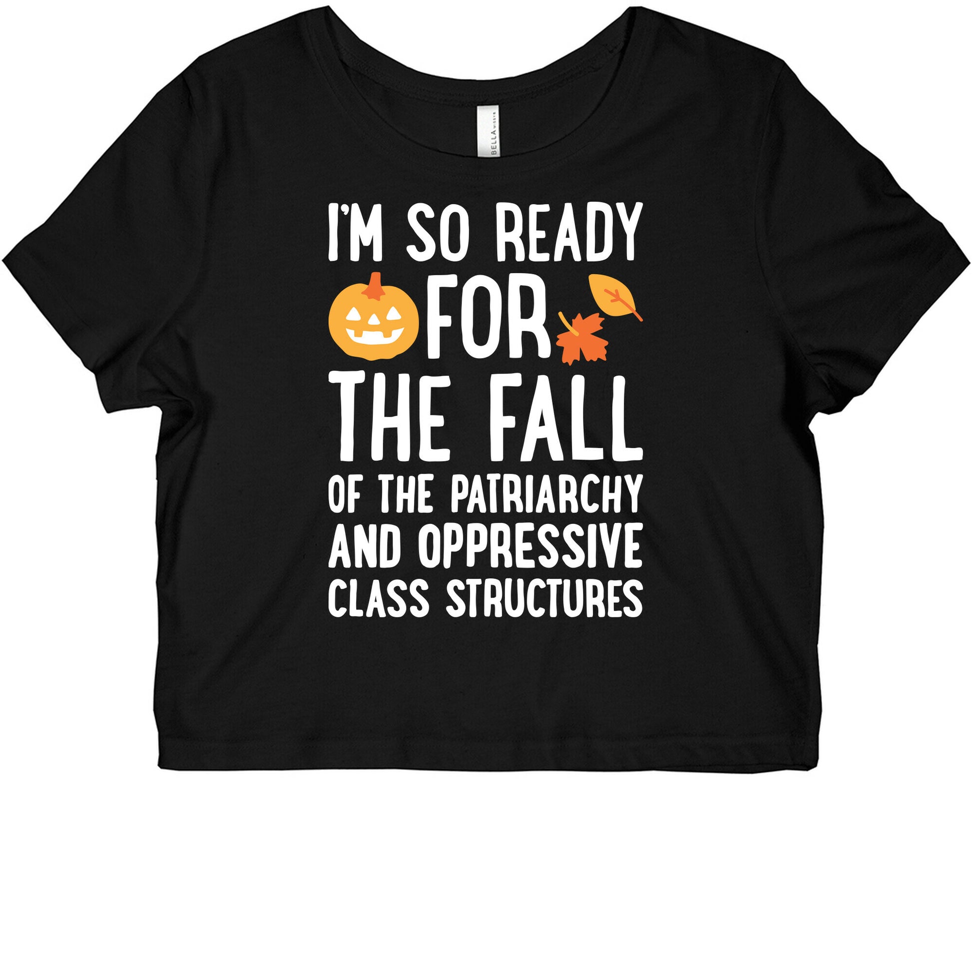 Show off your love of the fall season and social justice with this funny, "Im So Ready For The Fall \(of the Patriarchy and Oppressive Class Structure\)" autumn activist design! Perfect for activists, feminists, and loving fall! This customizable crop top tee is great for spring break, summer parties or for just looking cute and trendy. 52/48 combed ring spun cotton/polyester blend.