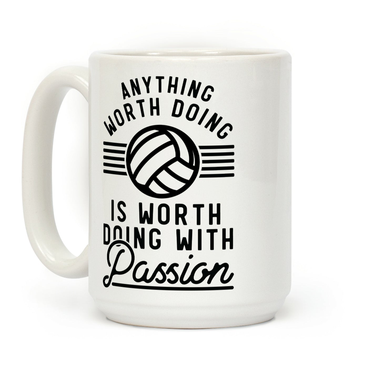 Anything worth doing is worth doing with passion! Show your love for volleyball with this pro-volleyball, pro-hard work design. Our Mug features large handles for easy gripping and a wrap-around print. These heavy-duty Mugs are both dishwasher and microwave safe. Printed in the USA.