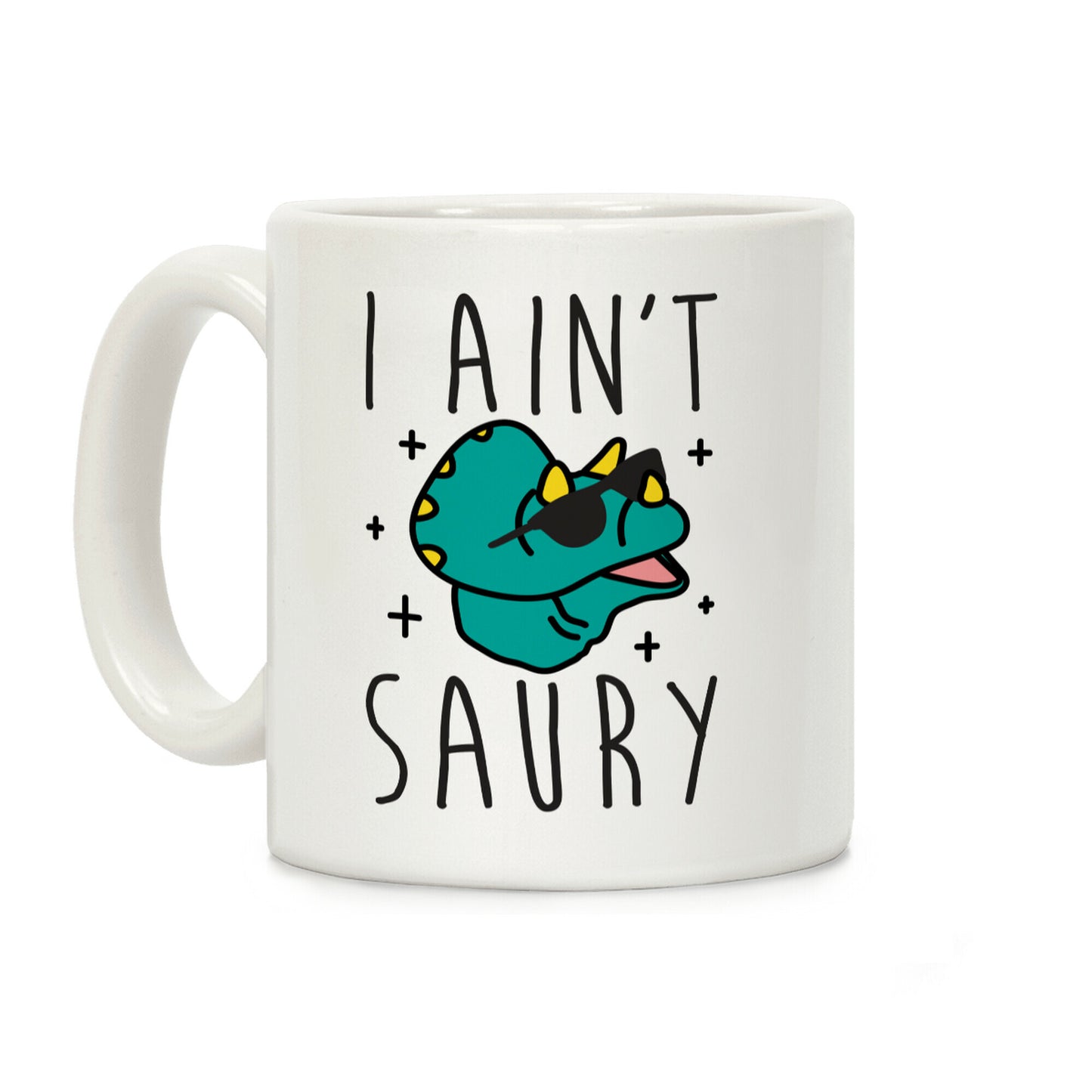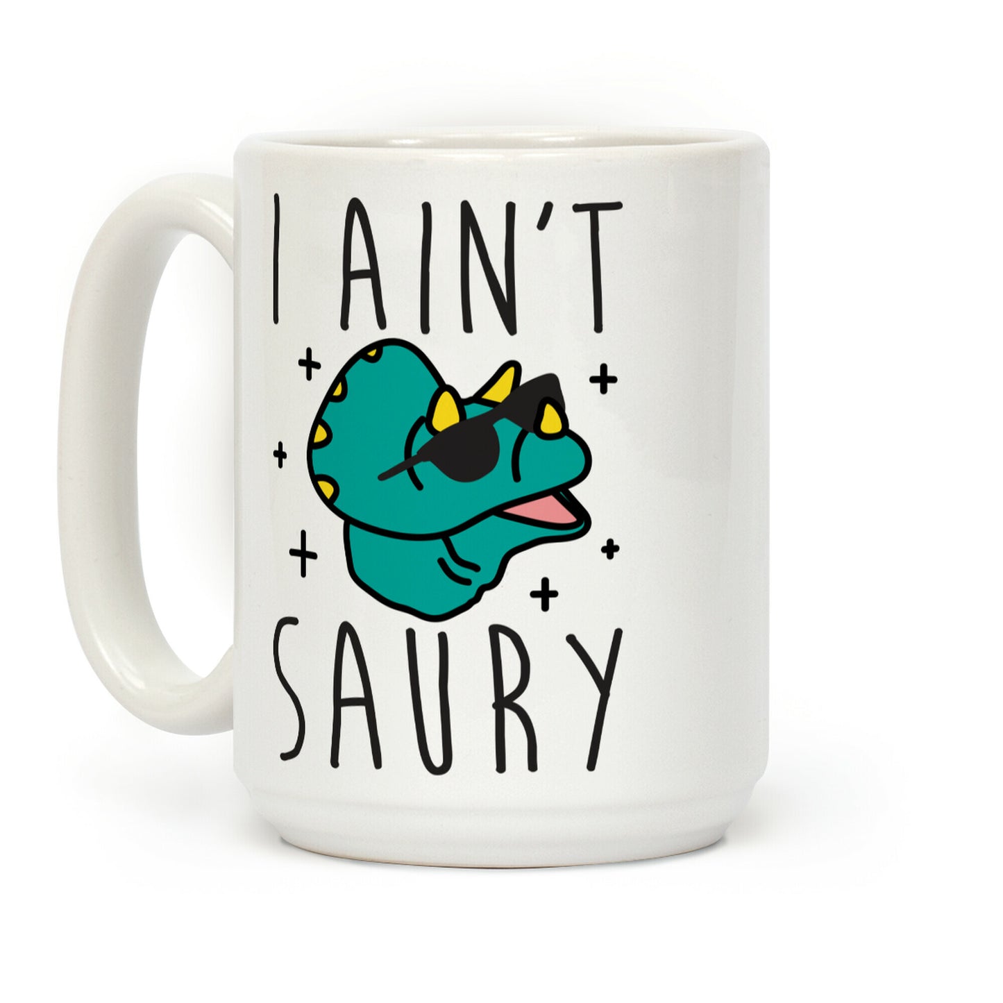 Get sassy and prehistoric with this, "I Ain't Saury" dinosaur pun design featuring a triceratops wearing sunglasses! Perfect for feeling sassy, loving dinosaurs, puns, and song parodies! Our Mug features large handles for easy gripping and a wrap-around print. These heavy-duty Mugs are both dishwasher and microwave safe. Printed in the USA.