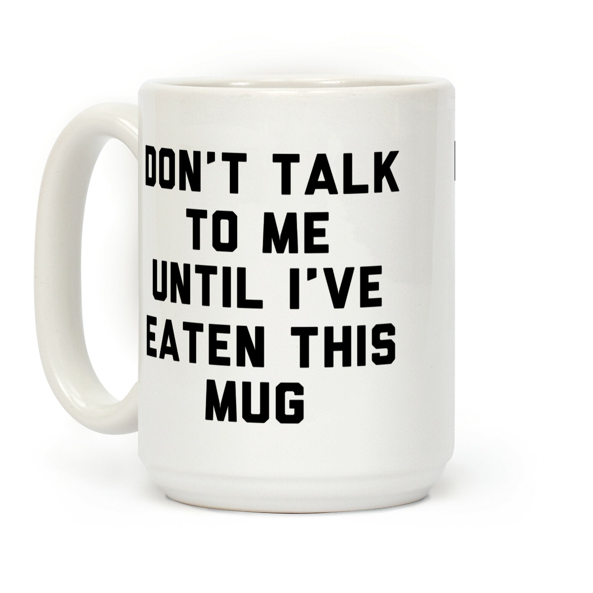 Don't talk to me until I've had my coffee and eaten this mug. Celebrate your love for the hot bean juice with this funny coffee mug! Our Mug features large handles for easy gripping and a wrap-around print. These heavy-duty Mugs are both dishwasher and microwave safe. Printed in the USA