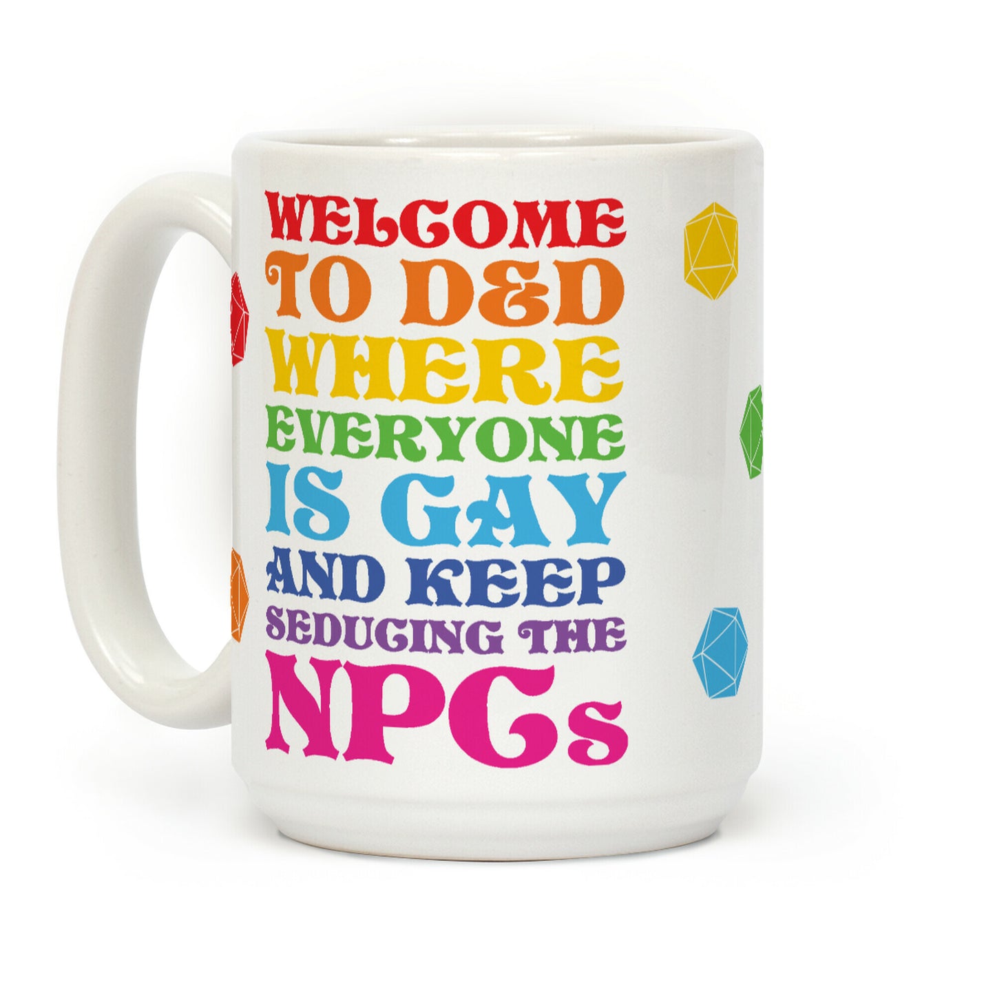 Show off your love of tabletop games with this super funny and gay, DnD inspired, nerdy Dungeons & Dragons parody coffee mug! Let your D&D party know that in D&D EVERYTHING IS GAY. Our Mug features large handles for easy gripping and a wrap-around print. These heavy-duty Mugs are both dishwasher and microwave safe. Printed in the USA.