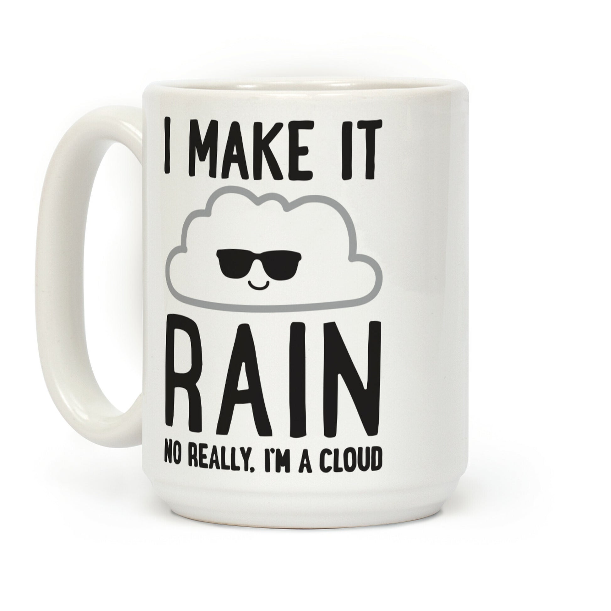 Yeah, I make it rain... no really, I'm a cloud! Show off your cloud coolness with this funny, "I Make It Rain, No Really, I'm A Cloud" design for being a cool cloud, making it rain, and funny nature jokes! Our Mug features large handles for easy gripping and a wrap-around print. These heavy-duty Mugs are both dishwasher and microwave safe. Printed in the USA