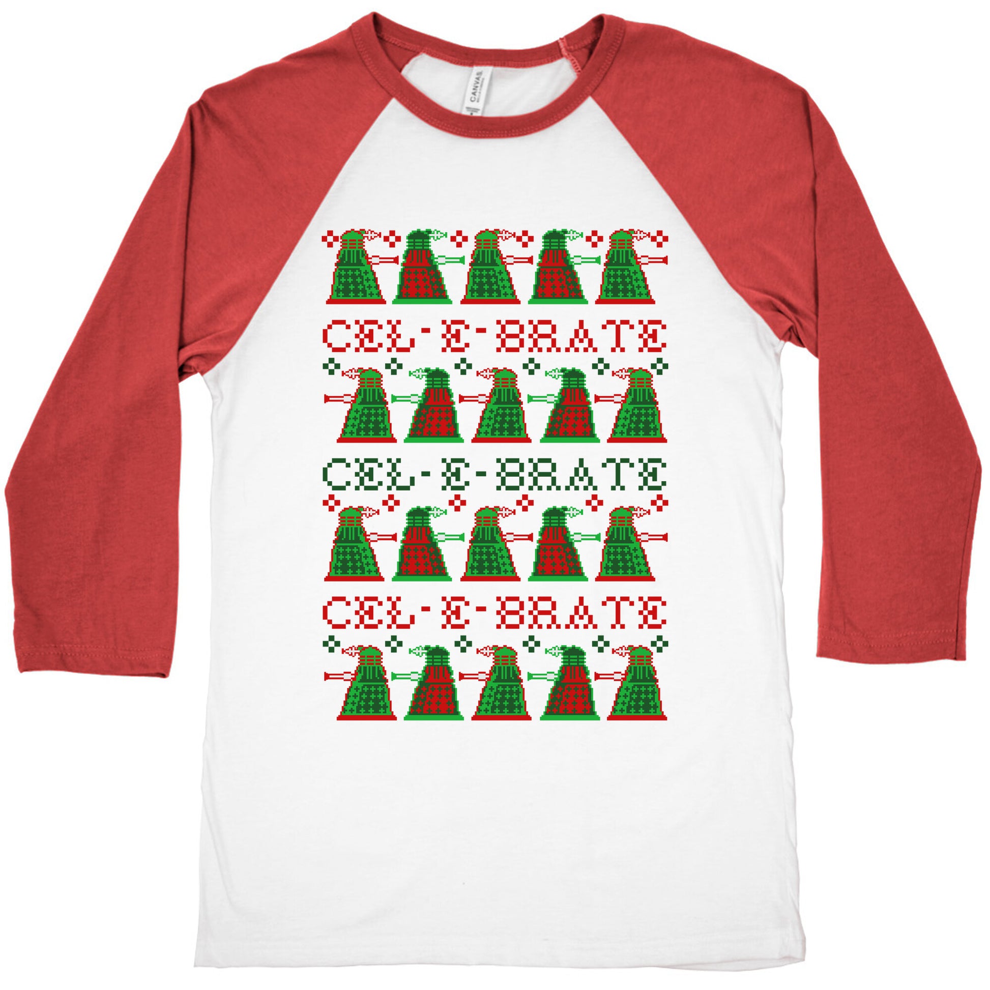 Exterminate those winter time blues and get ready to celebrate Christmas. This Doctor themed ugly sweater pattern features illustrations of Daleks and the phrase "Cel-E-brate." Our exceedingly soft and relaxed fit Tri-Blend Baseball Tee features a three-quarter length sleeve, crew neck, fun contrasting color sleeves and neck trim. Preshrunk for your convenience! Printed in the USA. Made with 50% Polyester, 25% Cotton and 25% Rayon