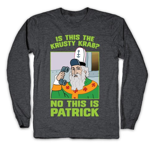 St. Patrick, to be exact. Don't call me Krusty, krusty isn't here. Hello? No, for the last time, this is patrick! No burger patty's here, ONLY ST. PATTY'S!Our Unisex Long Sleeve Tee is made from a soft 100% cotton jersey knit. It features a crew neckline with ribbed cuffs and hemmed bottom for durability. Preshrunk for your convenience! Printed in the USA. Athletic Gray is made up of 90% cotton and 10% polyester.