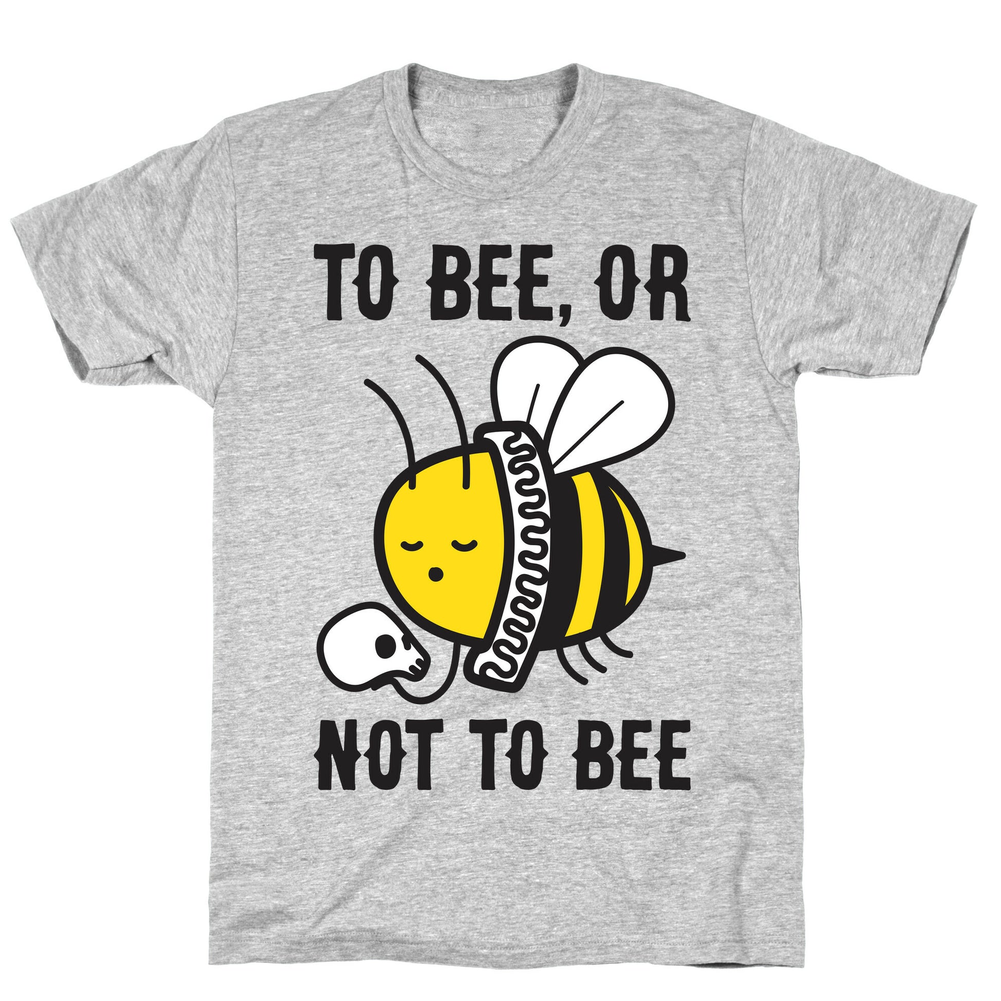 To bee, or not to bee, that is the question. Show off your love of bees, Shakespeare, and puns with this funny, "To Bee, Or Not To Bee" Hamlet parody of a bee holding a skull! Our fitted Unisex Cotton tee is made from an exceedingly soft 100% ring spun cotton. It features a crew neckline with hemmed sleeves and bottom for durability. Preshrunk for your convenience! Printed in the USA. Made with 100% Ring Spun Cotton. Athletic Gray is made up of 90% cotton and 10% polyester. Other heathered colors are made of 52% cotton and 48% polyester.